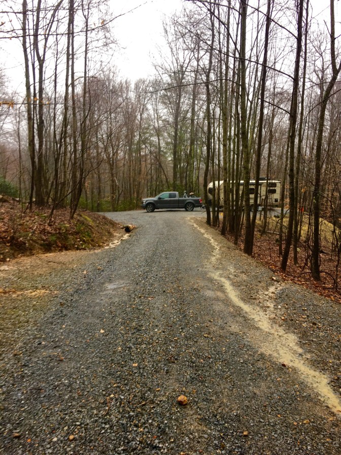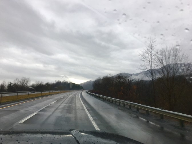 Bright and early this morning, battling lots of wind and a deluge of rain, we hooked up camper to truck and set out due south. Our mountains are beautiful even in the rain
