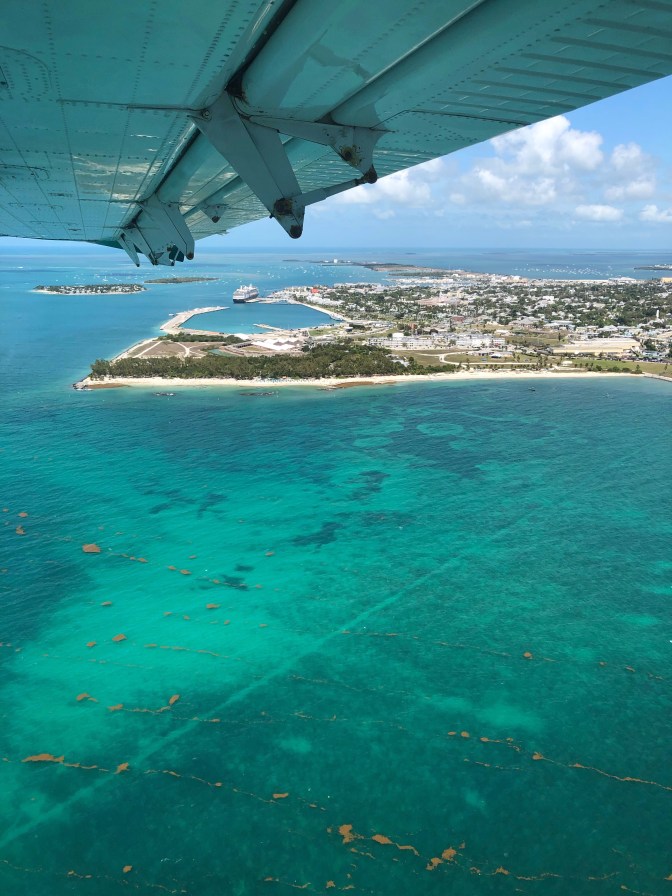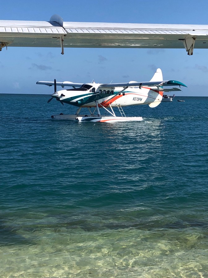 Headed back to the airport where we would Board a seaplane with pilot, Adam and 9 other passengers. We flew 500 feet above the ocean and I saw, dolphins, many turtles and a sunken ship from my window. Nice narrated trip by the pilot in our headphones. If you see the circular plastic on the window shots. That was our vent…natural air conditioning. The windows are convex so pictures aren’t the greatest from the plane.