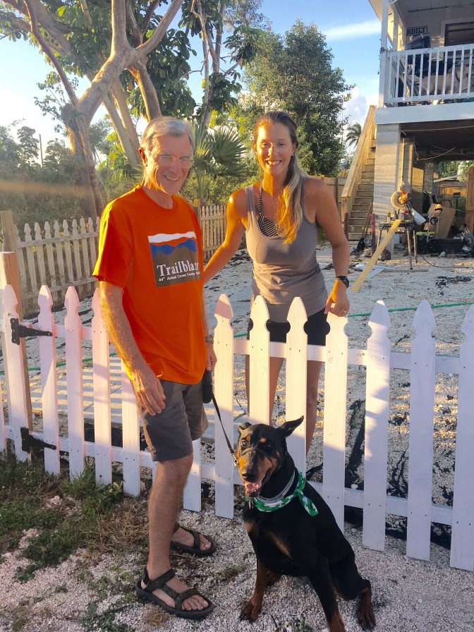 We started off the day at 6:30 am driving from Camp Flamingo to Big Pine Key as a waypoint. Thanks to rover.com we had found Harriet and her husband who do dog sitting along with their toddler and, 6 month old baby, and their 85 pound dog, Beau. They live on Big Pine Key in a home that was damaged by Hurricane Irma in 2017. They bought it a year and a half ago and are working on fixing it up. Anyway, we decided we needed a place to take care of her on this day, as we knew it would be loooong. Thanks to some pretty detailed texting and lots of references, we decided Harriet was the one. It was a great day for Onyx even if it was a bit weird leaving her there. First picture is of Harriet, Harry and Onyx…she is over 6 feet tall. Second is of Onyx after we picked her up and the whole four hour trip back to camp.