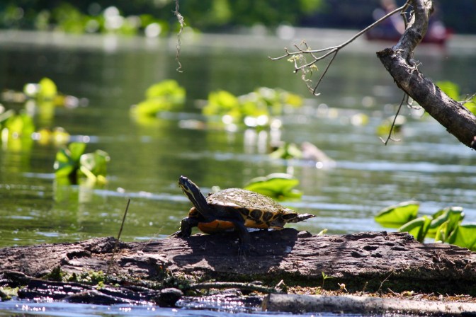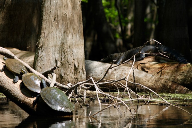 At first glance you only see the turtles but look on top the log to the right of them …alligator sighting.