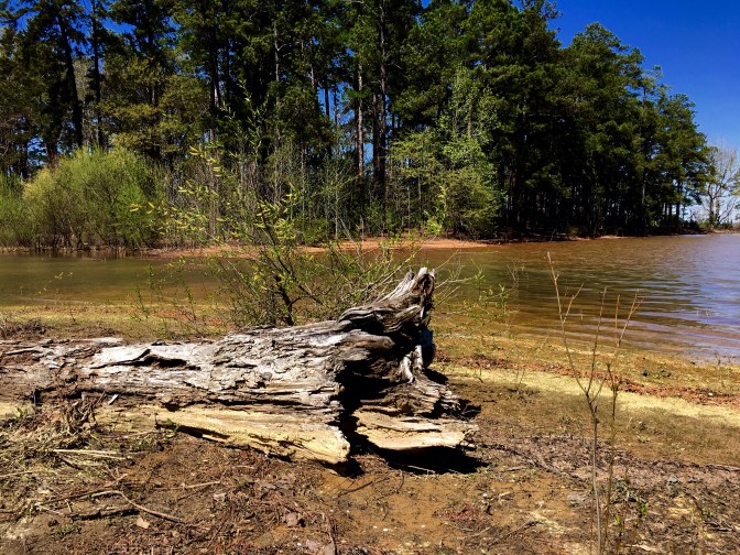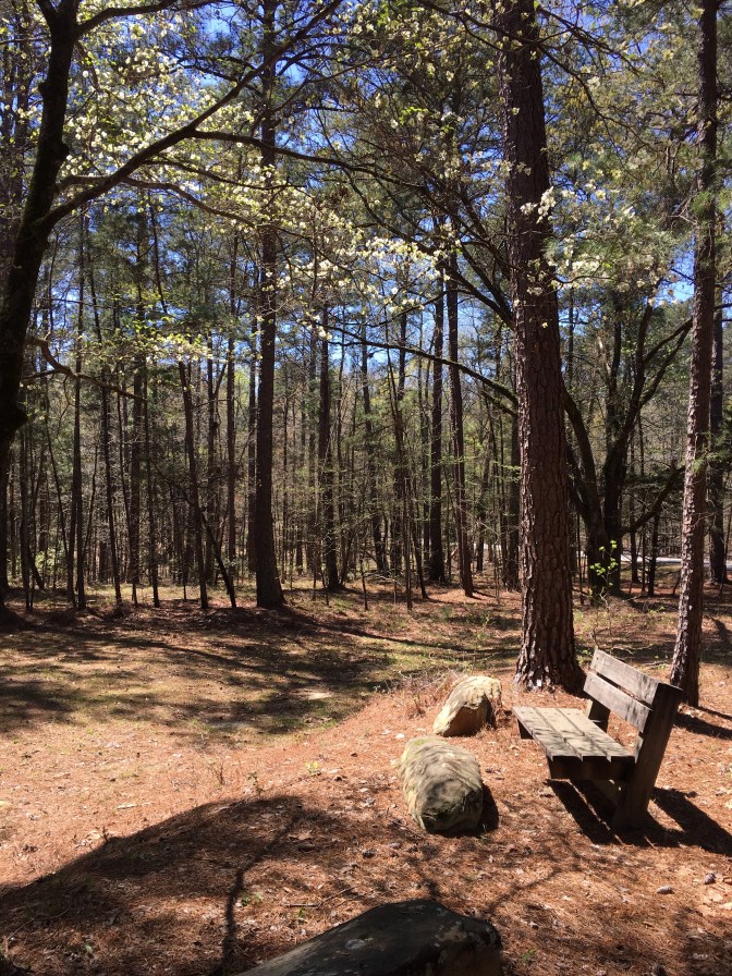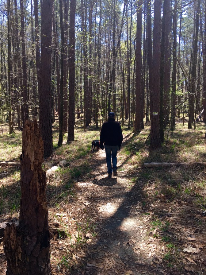 Took a hike with Onyx yesterday, after it warmed up some. We really didn’t come prepared for spring weather as much as for summer. Live and learn. The trail was well worn and easy to follow. Even though they seem to be in early spring foliage most of the ground is pine needle brown. Half of our hike was like these pictures.