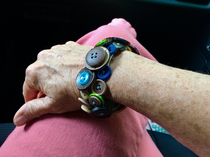Some of you know, I make bracelets out of buttons to help fund The River Ministry, a safe place for all women to wash clothes, take a shower and feel safe for the day. Well, my granddaughter, Kaitlyn made me a camping bracelet with no instruction from me. I am proud she figured it out all by herself! I told her she would have to join our Button Brigade. What do you think, Stacy Larsen?