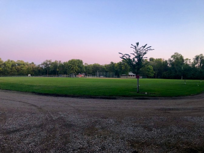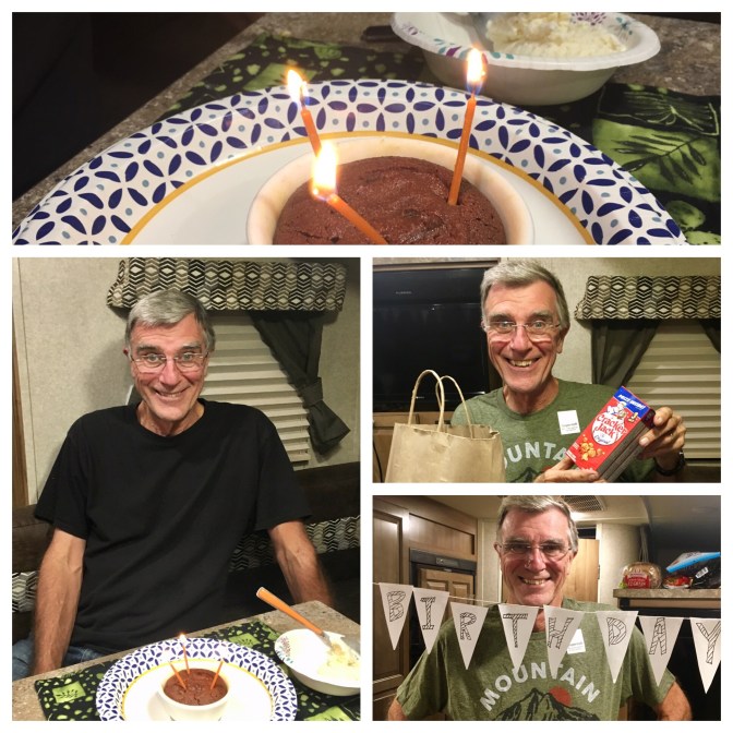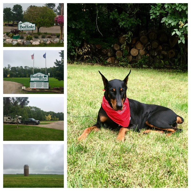 We celebrated Harry’s Birthday in the car while traveling down the road and in Buffalo, North Dakota. ( population 192 as of 2017). Wow…I didn’t know what to expect when Harry told me he had found the perfect place for us to stay in ND. He said it was a great campground run by the city of Buffalo. 8 full hook- up sites overlooking the city ball field and costing a whopping 20$ per night. All proceeds go to paying for the upkeep of the field. When we arrived we had our pick of places, so we took number 1. Other than the lonesome sound of a train whistle occasionally, it was a very quiet evening, spent celebrating Harry and talking with family on the phone.