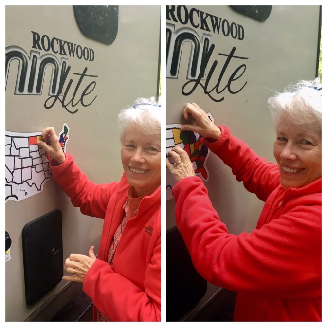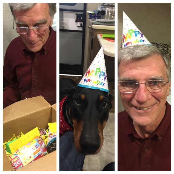 September 15- Arrival at Arnold’s Campground at dinner time yesterday…not my favorite campground of the trip but it is the only one Harry could find with water and electric hook-ups. And a bonus sewer connection made it the winner. We are very close to our neighbors but Patrick, who runs the place, was gracious enough to hold a package for Harry for his birthday. A day late but a good celebration anyway! Thanks M, C, N and K! Sweet surprise!