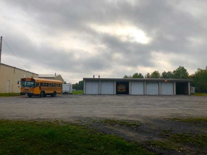 We have decided to bid Arnold’s Campground goodbye a day early. The rains have come in and we are parked in and around flooded ground, not to say anything about our early 6 am wake up calls each morning by the beep, beep, beeping of the school busses backing out of the municipal school bus garages. They just happen to be right outside our front door. Our pull through drive exits to their parking lot as you can see in the forefront of this picture. ( I told you this was the only full hook up campground in the area. I also told you this has been my least favorite site. Now you know why!)