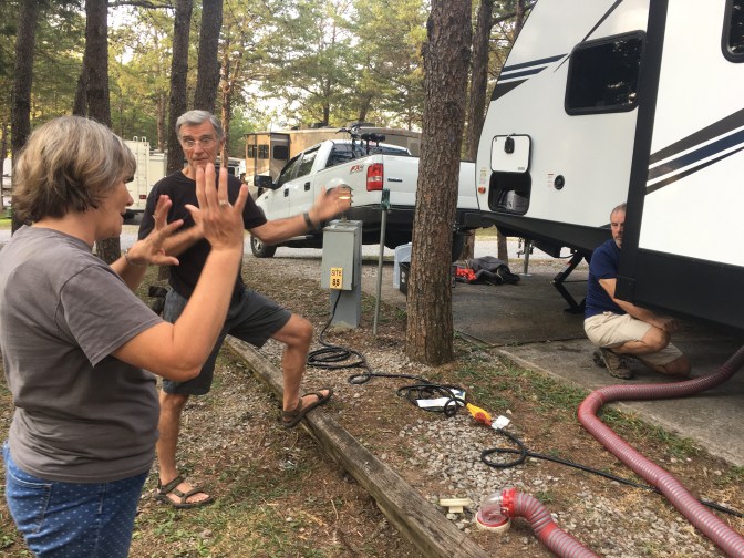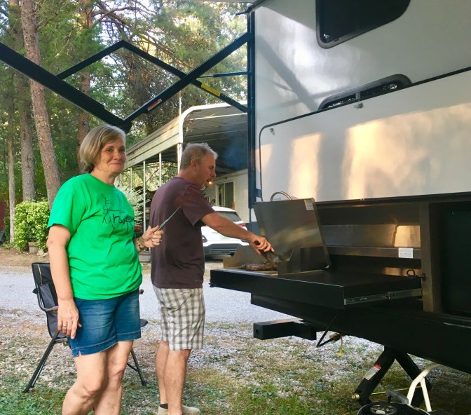 We are home! Spent last night being treated to a most delicious pork chop meal with our dear friends, Cheryl and Tim Bowers in their brand new camper! She’s a beauty! They have made the move to do this full time for a year…sold their home and put things in storage and now…they are off and rolling! We wish them happy miles and safe travels and hope we can be side by side neighbors again soon!