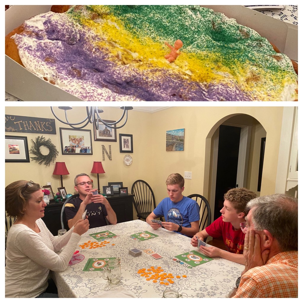 We topped off the evening with a delicious dinner with all four Nelson’s in their lovely home! They were gracious hosts and even helped test play Harry’s game of Campground Chaos. King Cake for dessert! Yum!
