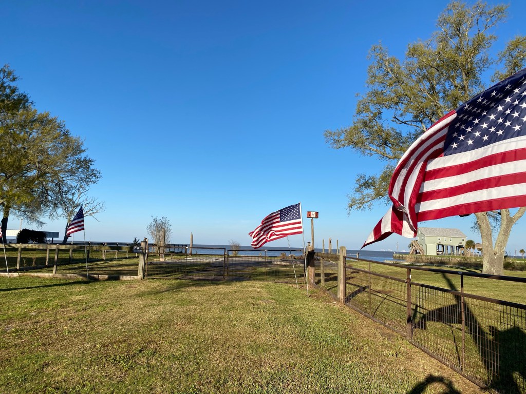 The Gulf is in the background. You can see several flags in this picture but there were more American flags in this small area than I could shake a stick at. They are truly patriotic here.