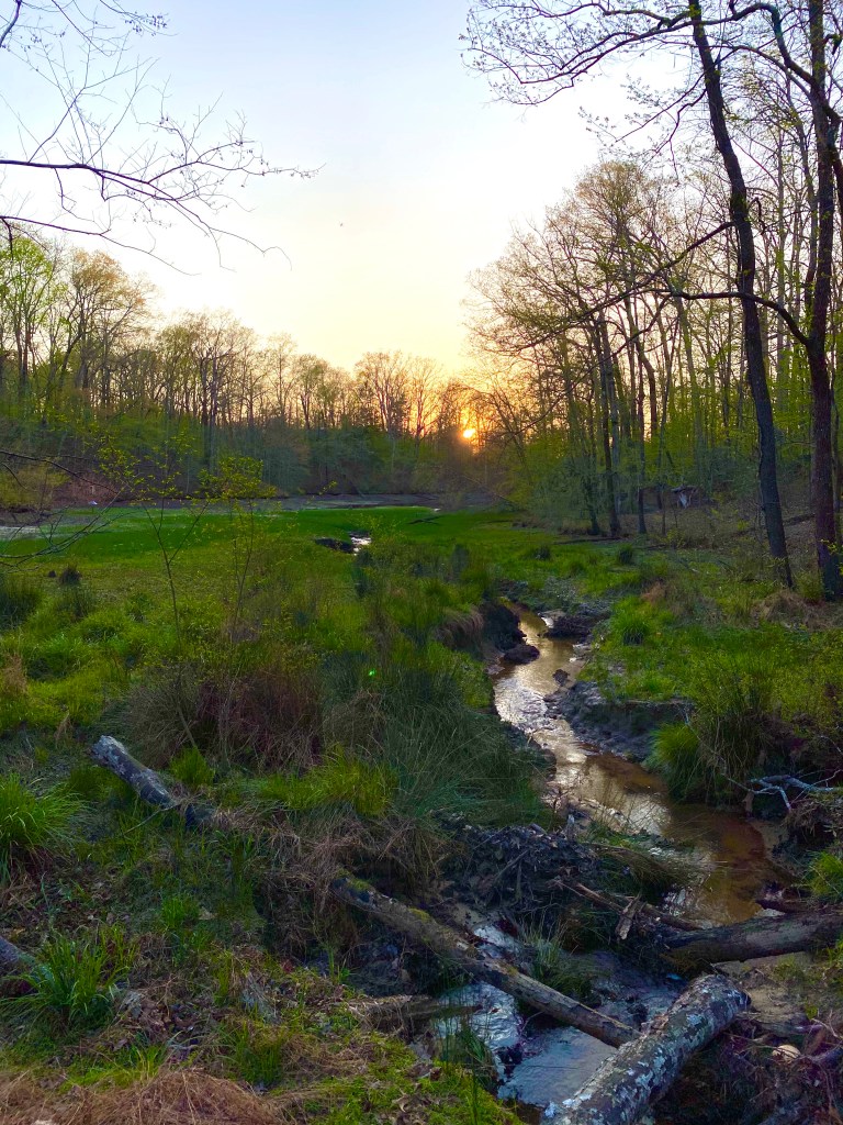 After dinner, we took on the Tree Trunk Trail. We just barely got off the trail and on the road to our camper before God turned the lights out on us! Definitely hiked long into kid light. It was a nice hike…lots to look at and it paralleled a frisbee golf course. Onyx had a grand time in the lead as always…even captured a frog before we could stop her! Poor guy. He hopped away but he had a big story to tell back at the swamp bank.