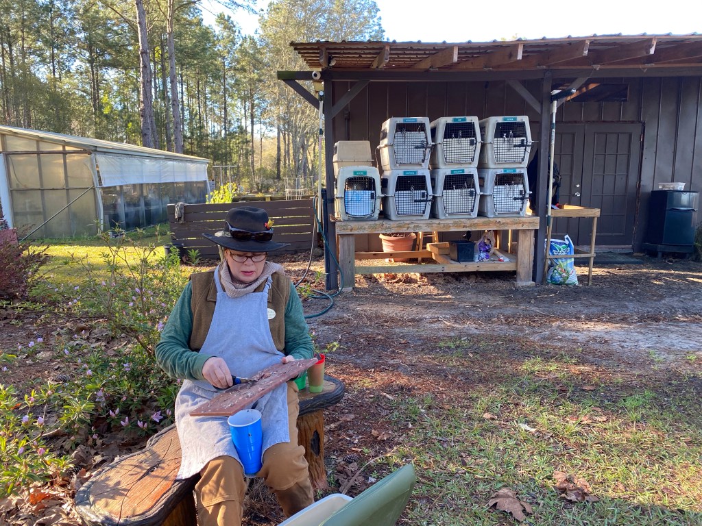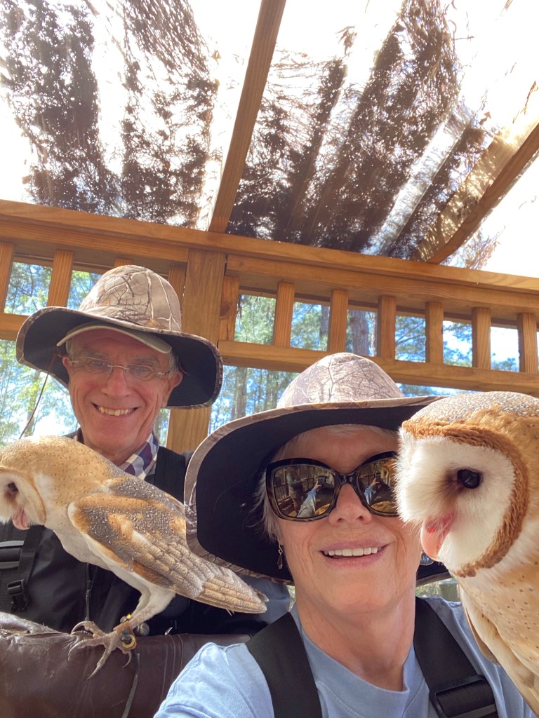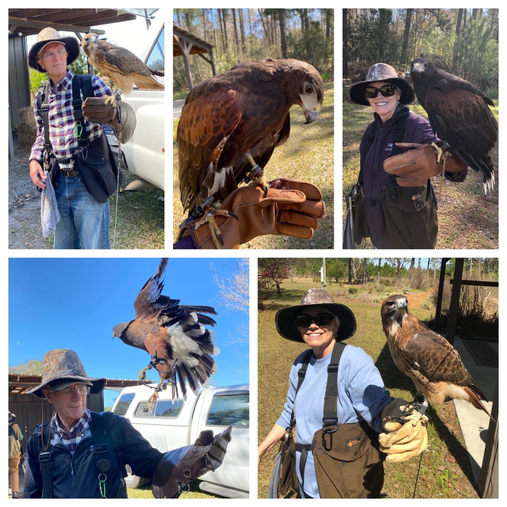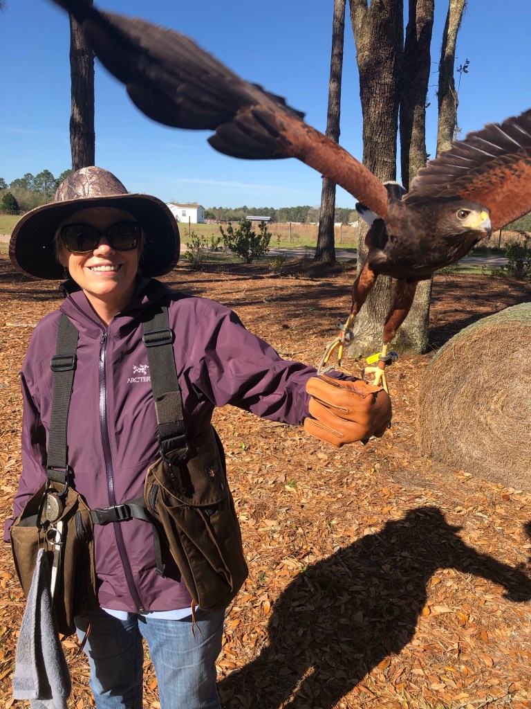 Being falconers for the day has been a true highlight of our trip! We got up bright and early this morning to join Kitty Carroll, raptor specialist with the International Falconry Academy, at Hearthstone Gardens. This is how we found her when we arrived.