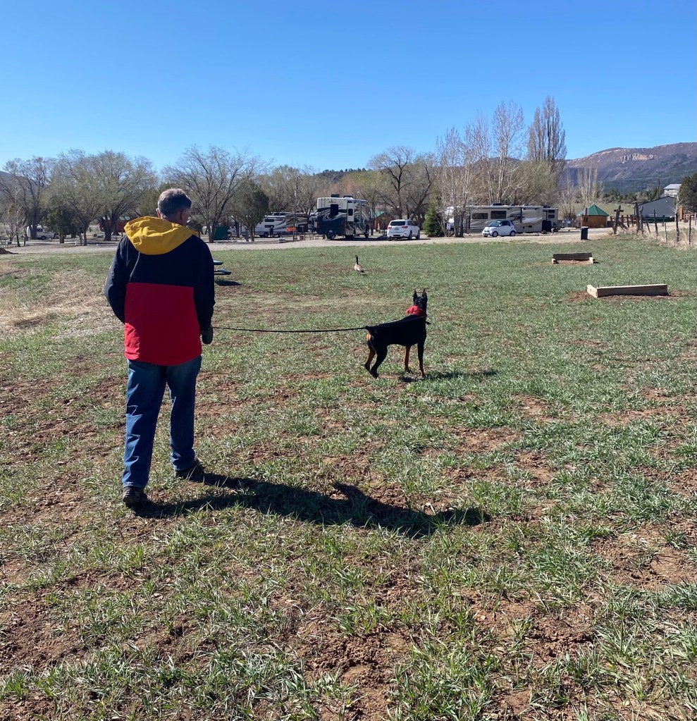 Back at the camper, Onyx remains the vigilant goose chaser!