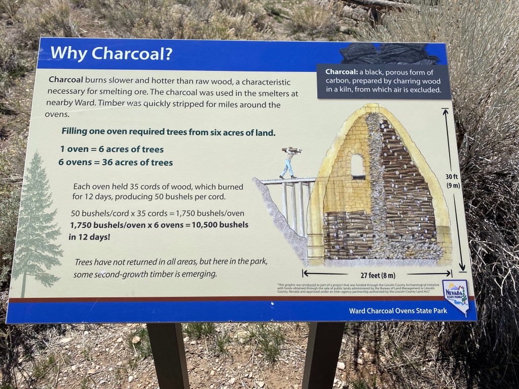 Ward Charcoal Ovens- These ovens were constructed during the mid 1870’s and are larger than any other ovens of this kind in Nevada. 27 feet in diameter and 30 feet high. Each had the capacity of 35 cords of wood which was burned for a period of 12 days to produce about 50 bushels of good solid charcoal per cord. This stripped the area of all timber for a radius of 35 miles.