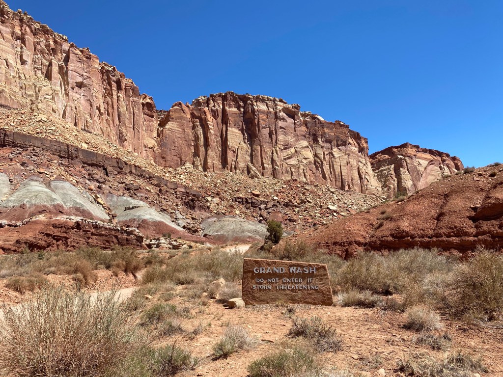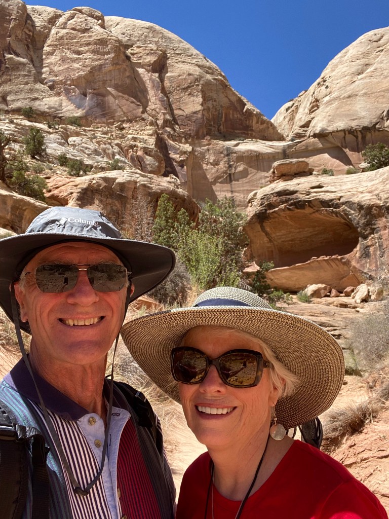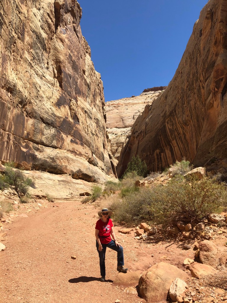 April 30, 2021- Capitol Reef National Park- We registered 13,501 steps today. It was an easy, 80 degrees, in the slot canyon we traversed. If you visit these western parks, you really should bring an all wheel drive, at the very least. We have had our truck in four wheel drive more than on any trip and we sure needed it! We had to use it getting to the trail head today!