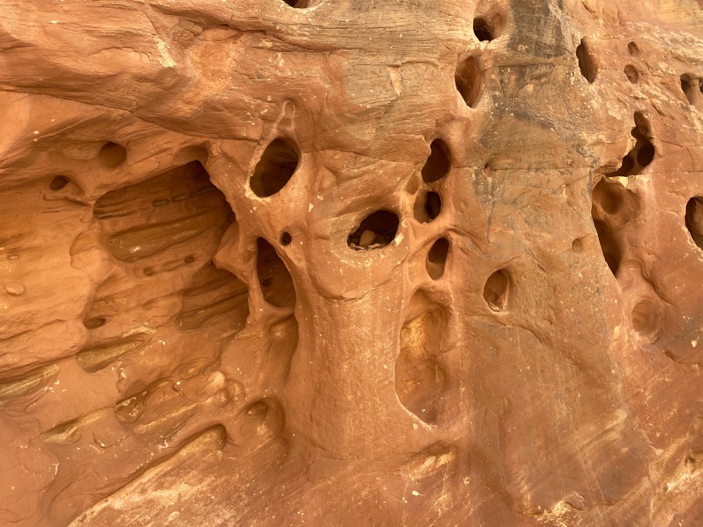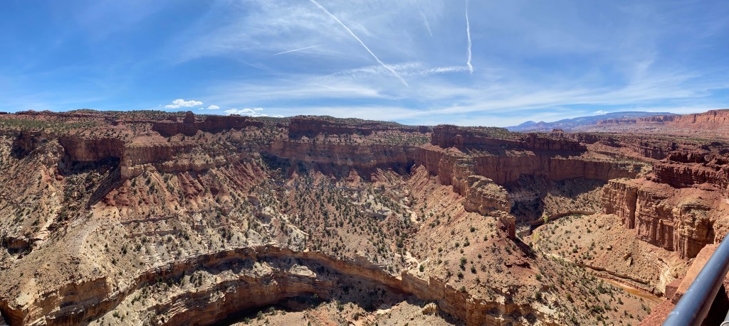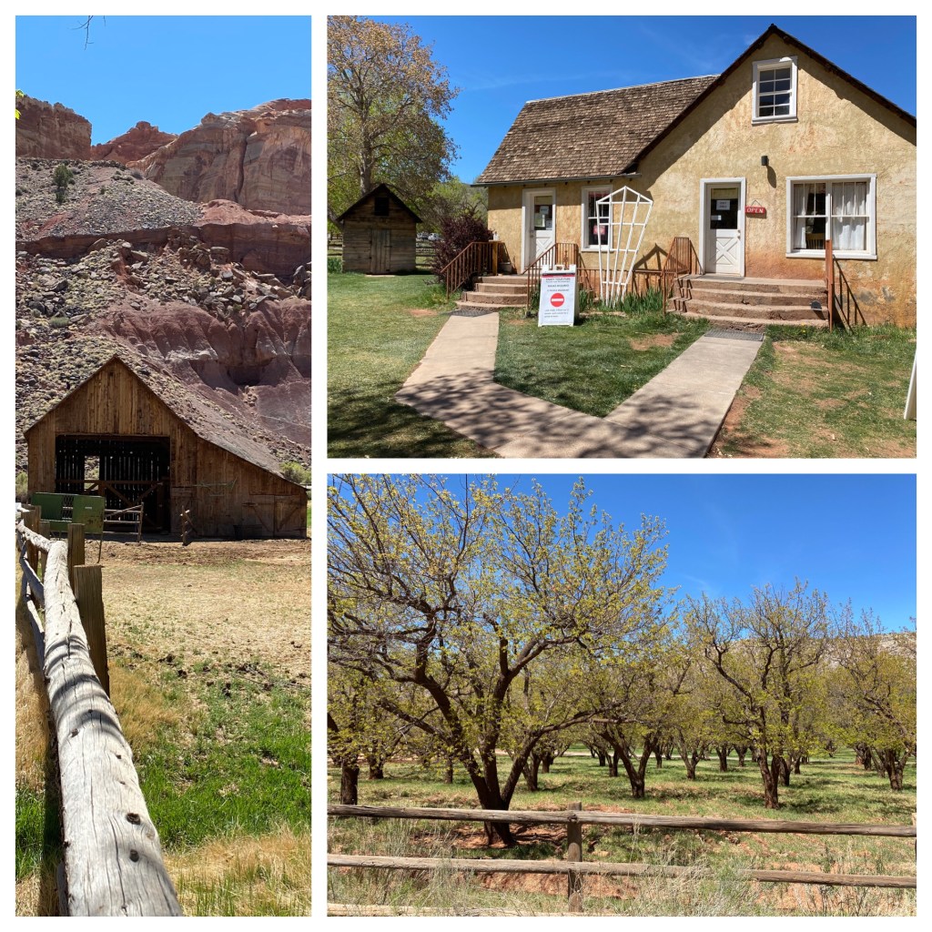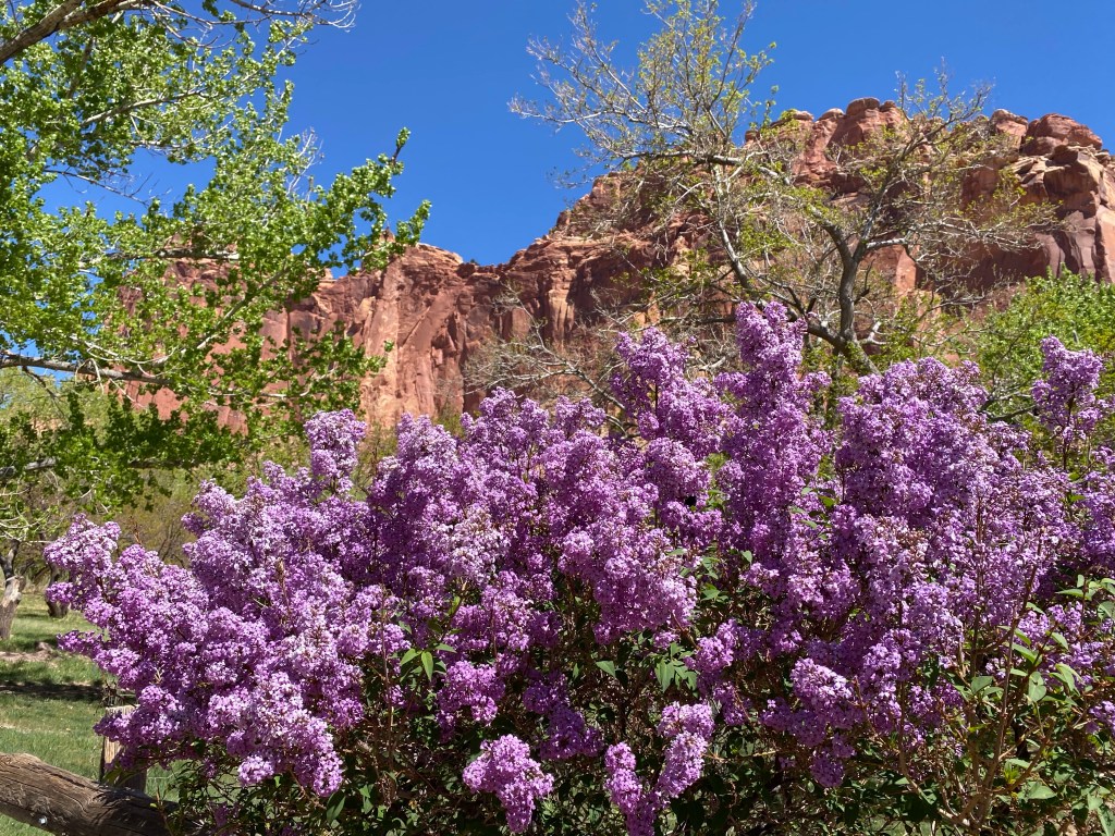 We didn’t know what to expect but Capitol Reef has delivered profound beauty.I confess, I am a lilac lover! I couldn’t resist this shot of the red wall!We visited the Gifford House in Fruita , Utah. This area had fifteen orchards- 2000 trees and just like The Great Basin Orchards…if they have fruit, you are allowed to pick, although you may have to pay a small fee. The house in the upper right is the Gifford House, they sell canned goods from their trees and little hand pies. Harry shared a mixed fruit pie with me for lunch. Very yummy!The Grand Wash was a really fun hike! If you have been to Zion National Park and walked through the Narrows in ice-melt waters, over slippery rocks in water, sometimes up to your thighs…this was very similar, only you walked on the dry river bed! No dogs allowed on this hike. It would have been too hot anyway for Onyx!We were fortunate to see this mountain goat! Truth is, I don’t know if he is old or not! He was browsing on the shrubs growing up on the rocks. And didn’t seem to be bothered by the fellow hikers.I know this is a strange picture but there were quite a few of these holes eroded into the walls. Some of the young men on this path thought it would be fun throwing rocks from the stream bed into them as most were very high! Can you see the middle hole has some it has collected.The view from Gooseneck Overlook- trail 600 feet.More fun at Capitol Reef tomorrow!