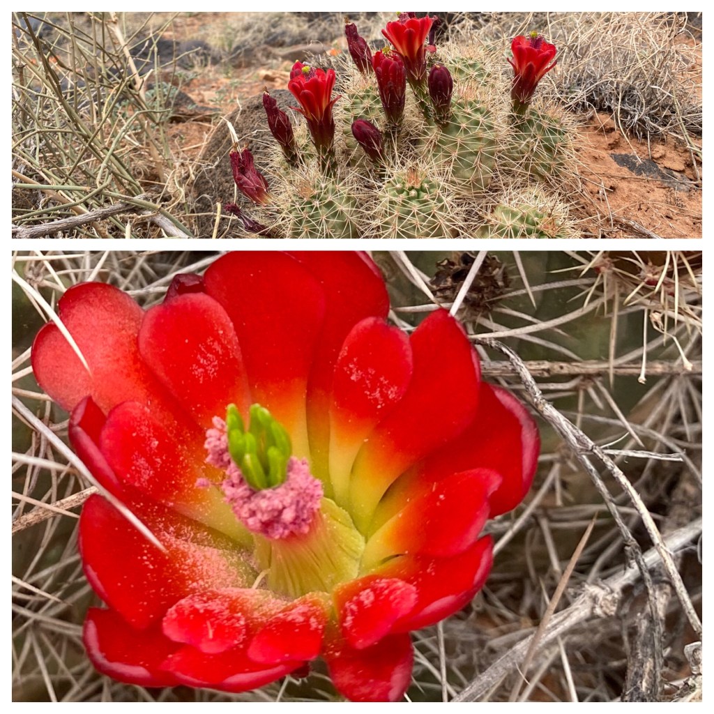 I think this bloom is a red hedgehog cactus. On our way up, it hadn’t even started to bloom but on the way down they were glorious!