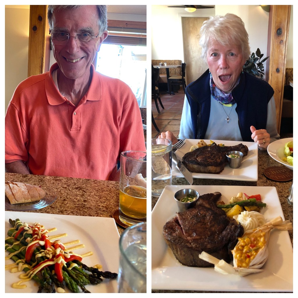 We have not had one meal, not breakfast, not lunch or dinner out but when we saw the crowds here we just had to stop. We needed a reservation and it was a bit pricy but the food was delicious! We had an asparagus appetizer and we both had blackened prime rib. I almost have a whole take home meal in the refrigerator left over from tonight, here in the camper as I write. It was delicious but enough for two of us!