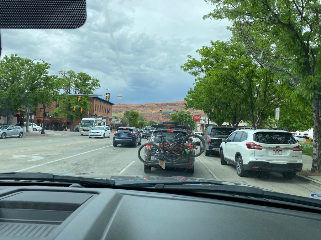 As we drove into Moab, the mountains began to rise again in the distance and once we arrived, we realized the mountains kind of sandwich it. Moab seems to be a town with lots of hotels, restaurants and brewery’s. Crazy traffic and it was a wild time grocery shopping for H and I. Who wants a wild time grocery shopping?