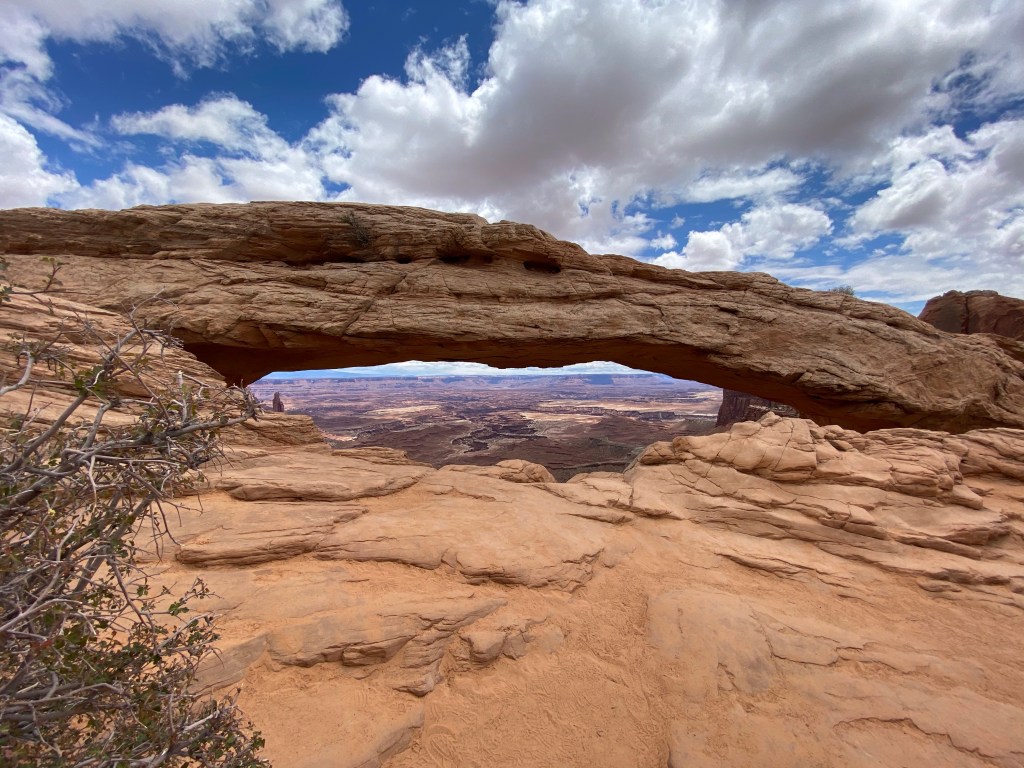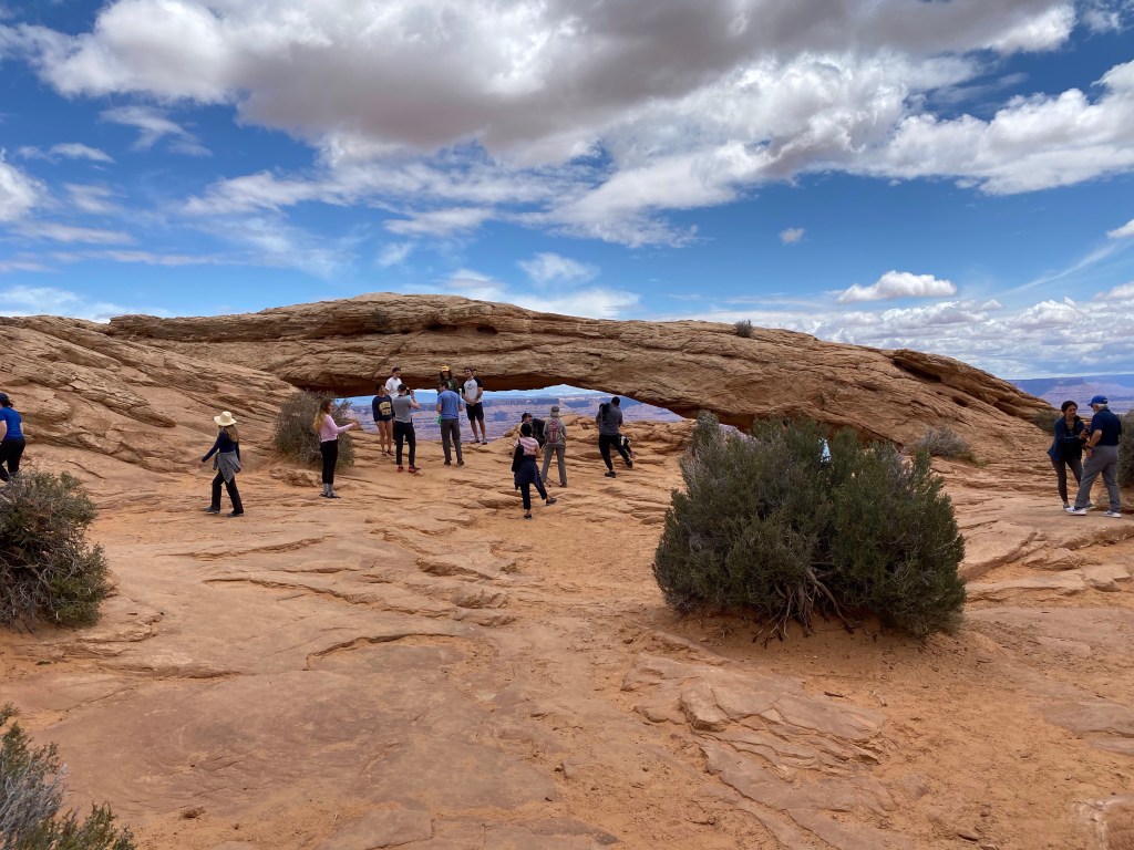 Our first stop was a short hike to the Mesa Arch! Normally, I do not show you crowd shots but this is the arch with people. I would have liked to get this far back to take it unadorned with people but I had to settle for more closeups of this beautiful formation. You would start to take a shot and a group would jump in front.