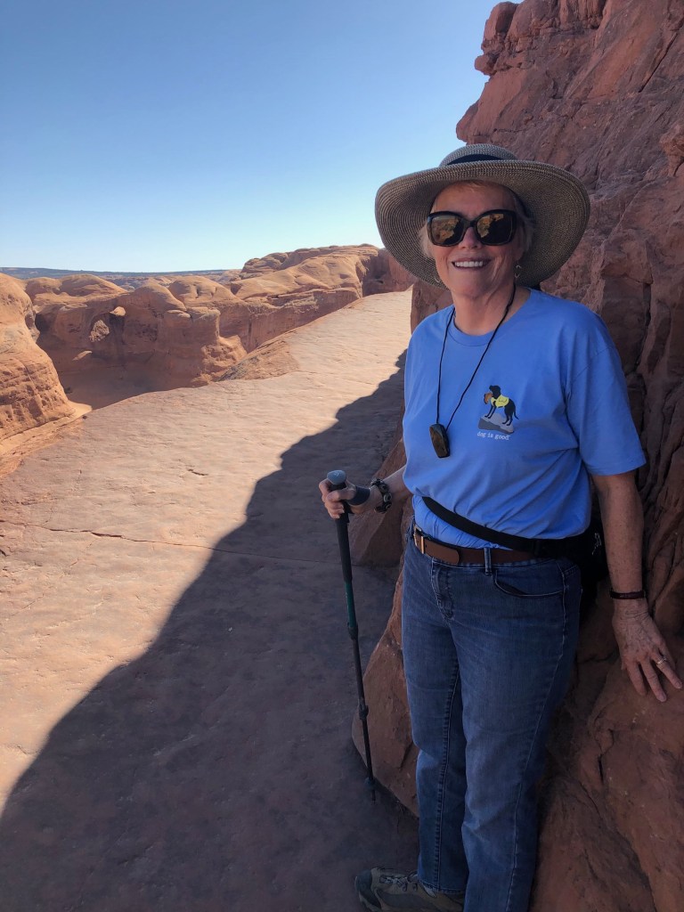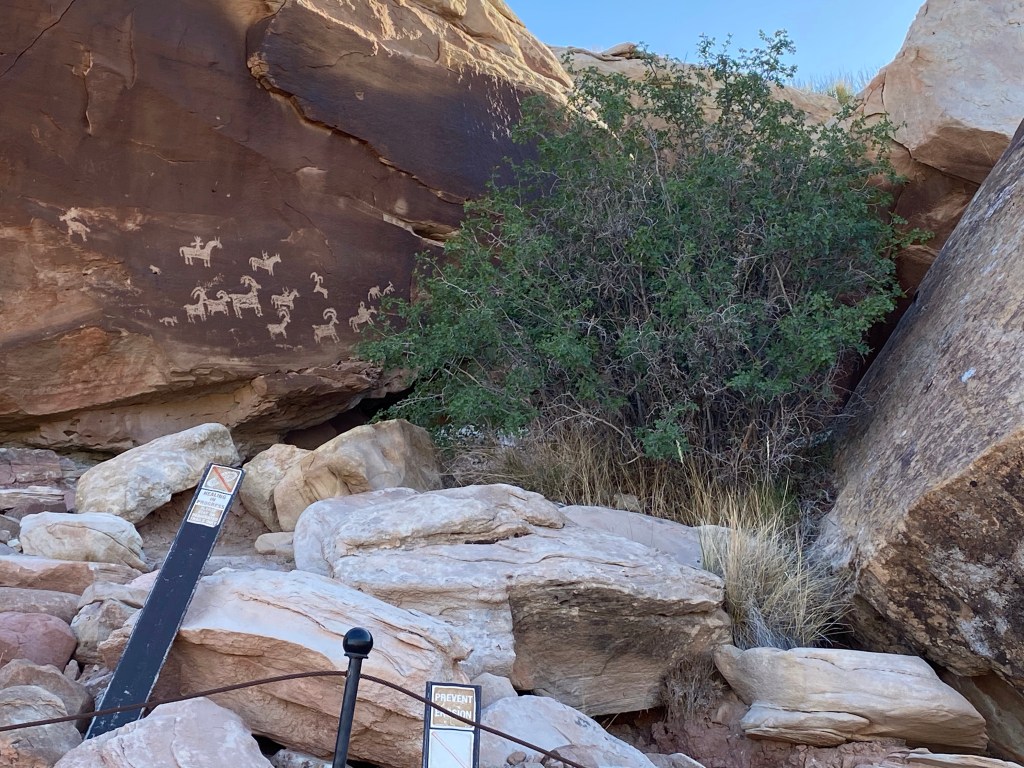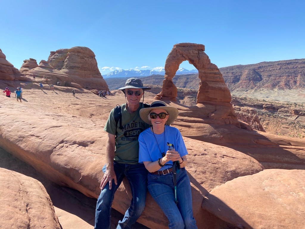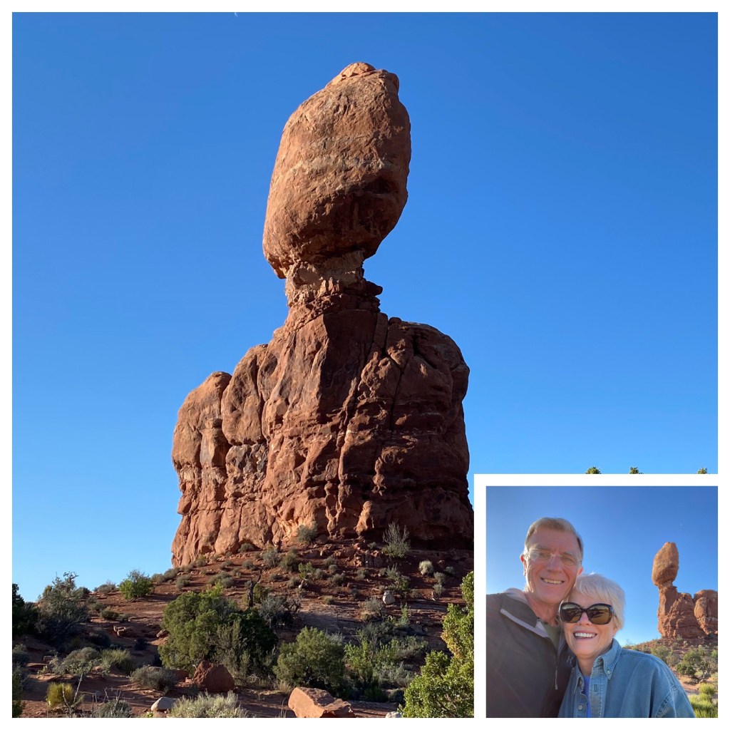 The Delicate Arch was on our agenda next. More mileage to travel and it was rated moderate. There’s moderate and there’s moderate. This one proved to be easier than yesterday’s! We enjoyed seeing the Wolfe Ranch from 1898, complete with root cellar. Also a nearby rock wall had some beautiful petroglyphs which shows the Native American was here long before the Wolfe’s. We did have to go over 1 slick rock that was huge and one at the arch. If you wanted a picture of yourself by it you needed to climb over a rock wall and make your way across another slick rock. Perhaps the pictures will demonstrate it better than I can explain.