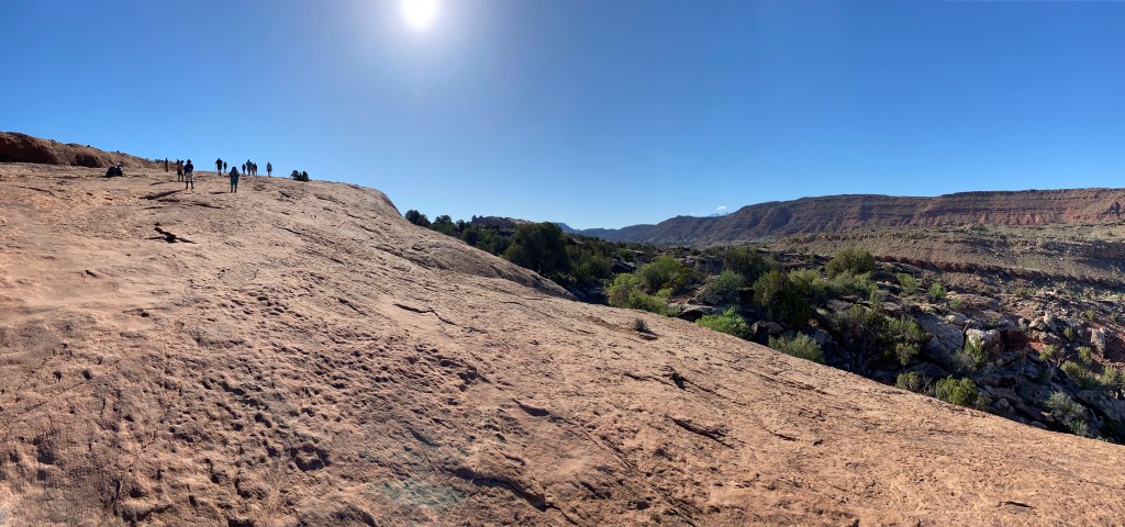 This is the slick rock. Harder to go up than down. No trail markers…just follow the crowd. For hopefully, the easiest way.