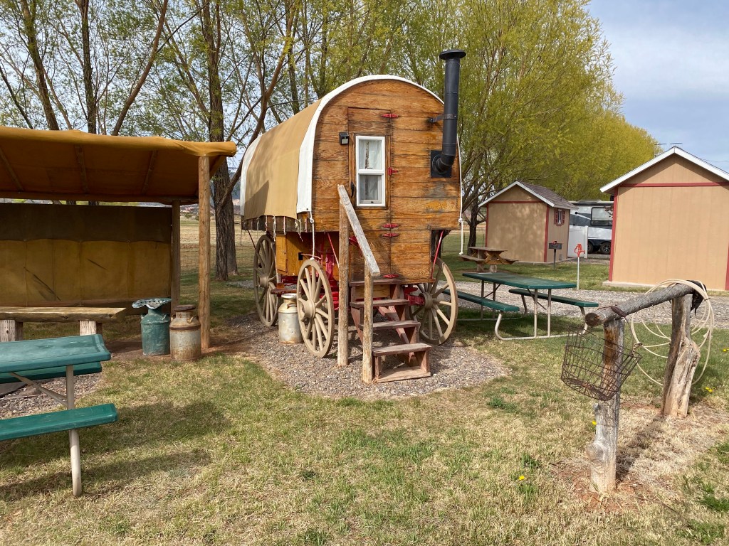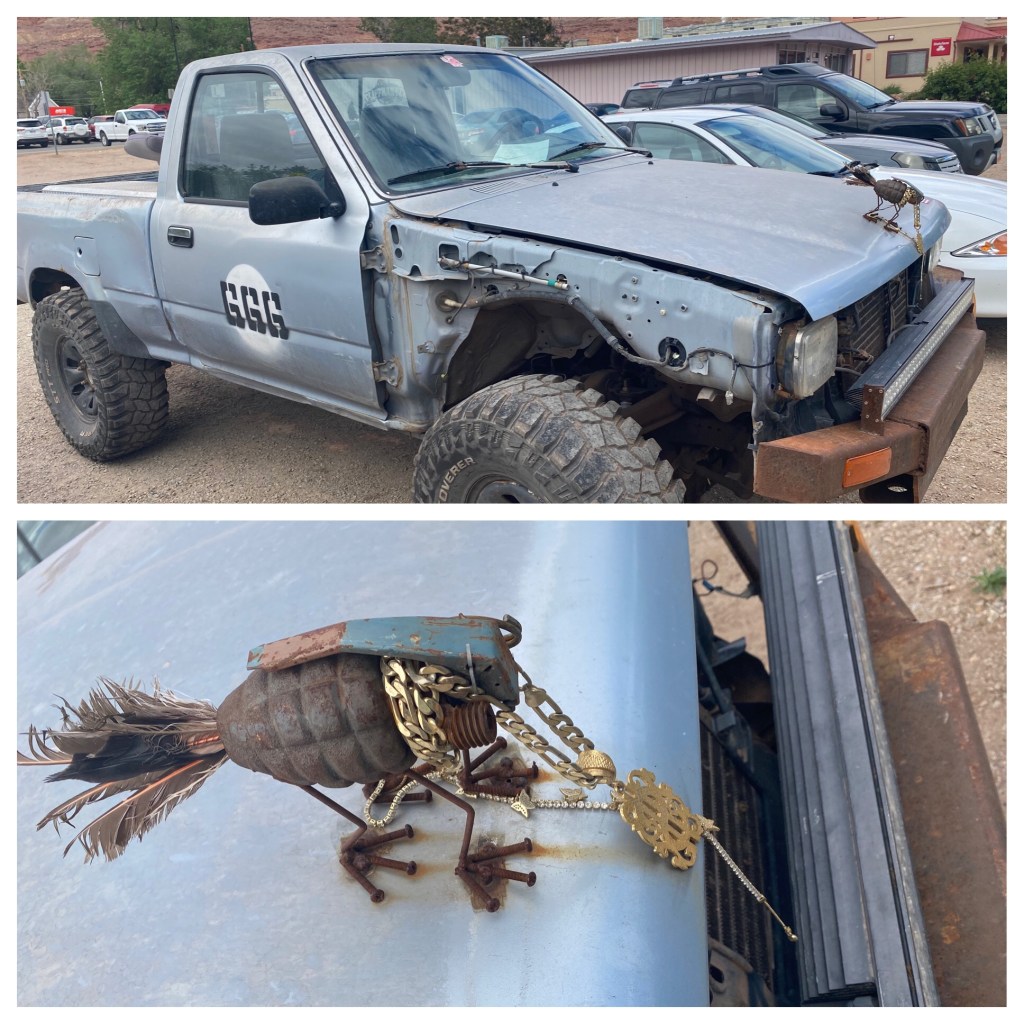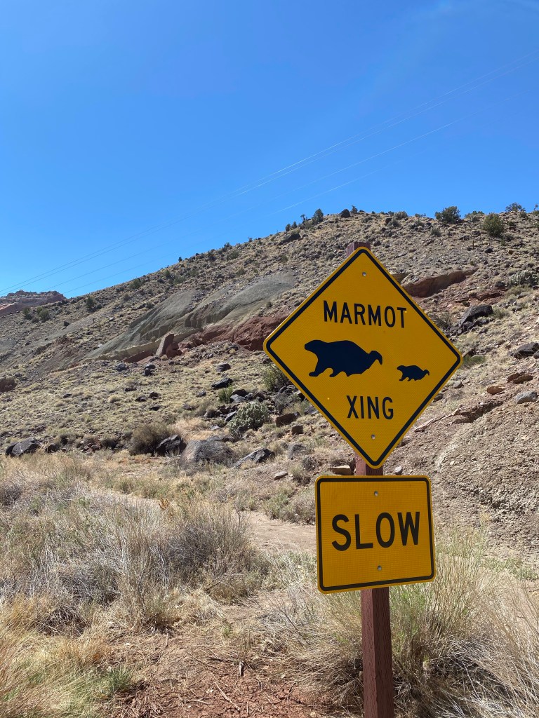 Did you know a sling hammock is an accessory for your Jeep? A place to read and get a tan, while everyone else hikes.Just a couple of unusual gates.I imagine this truck belongs to a soldier. I would be interested in knowing the story behind his hood ornament. Might be a sad story?We enjoy sculpture and this made us smile! Can be found in the city of Montrose,Colorado.OK. I over- rode Harry’s veto of showing this. It was in one of our National Parks. We have traveled overseas but to find this in the US was surprising. What are the handrails for? So low. Oh, well, that’s enough of that.We thought our son, Ryan would enjoy this sign we found on the road in Capitol Reef! Several years ago he spotted marmots playing around a vacation home we were staying in in California!At the Wonderland Campground in Torrey, Utah… you can rent a Conestoga wagon to spend the night.By the way, the Sawicki girls found their geo cash we had hidden for them! A video below!You are so welcome! Great job!This was painted ON THE BACK of a store. The ravens have entertained us and I just thought it was cool!I know you were wondering if Onyx ever had her nails worked on while we are on the road. Yes, Harry uses the Dremel Drill/ Sander on them once a week.