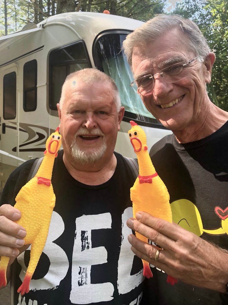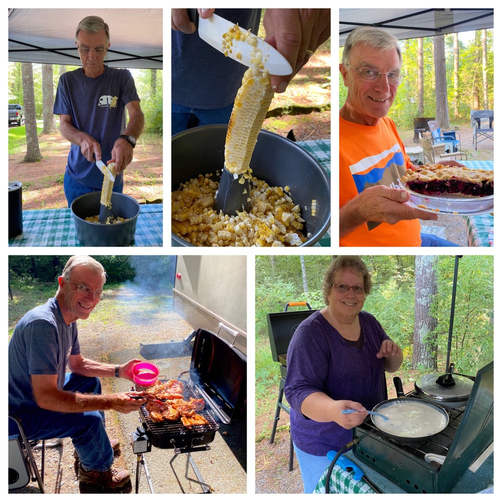 Trust me…I did my share of cooking but I have no proof of it in pictures! Have you ever cut corn off the cob using a Bundt pan? Super easy and the bowl catches all of the kernels. I was making a street corn salad recipe and I had lots of help! The top right picture is Harry with his Birthday Blueberry Pie!Harry even had flags for his Birthday. It is a tradition we have at home so he was surprised to have them here. Now the two lanterns are the hot finds of the week! One of our fellow campers had all sorts of these solar lanterns made from candy dishes for sale. Ruthann and I decided to support their efforts. It was a joke the whole week because they would only stay lit for 30 minutes once it got dark. Harry and Dave think we squandered our twenty dollars. Do you agree?