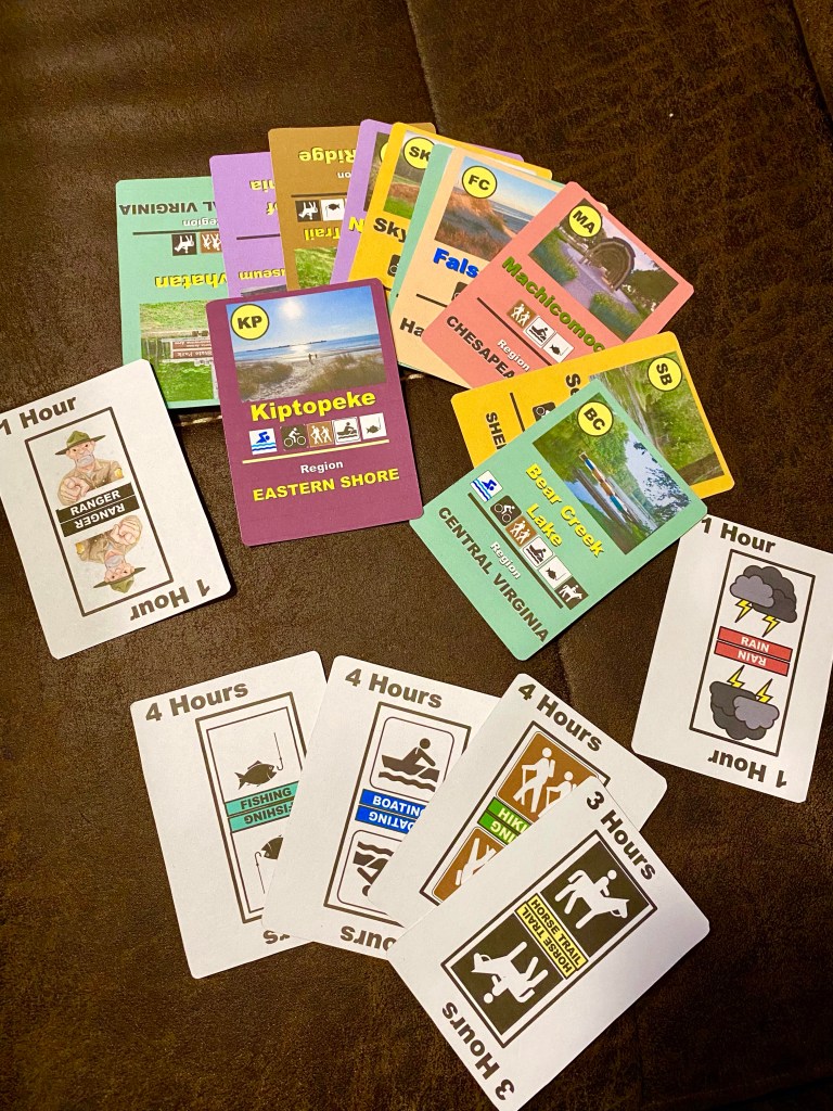 Most of you know, Harry is a board and card game maker. One of his most recent is Parksapalooza-Virginia. It features all of the VA state parks. Last week we visited one and yesterday and today we have visited two more. As we have test played his game we have talked about the parks and their amenities. Below you will see a snapshot of his game and the last two Virginia parks we have visited.