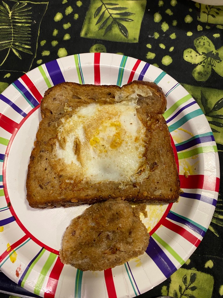 We got our wires crossed and what I had out defrosting for dinner tonight was placed back in the freezer so what do you do when that happens? You make “Toads in a Hole.” Anyone out there make them for your family?