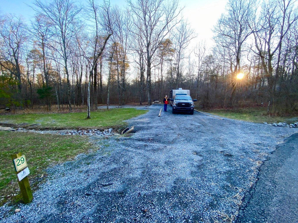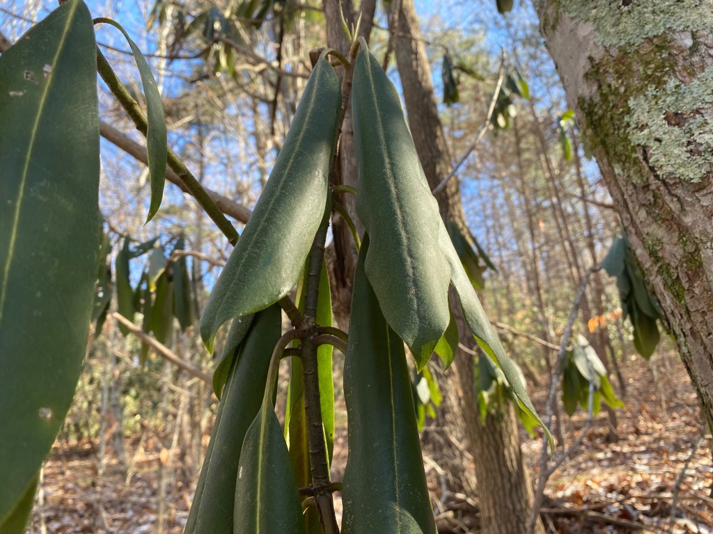 When we left Tennessee, the rhododendron leaves were rolled up tighter than a newspaper and it was cold. Picture below. We are hiking among the rhododendron tomorrow so we will be able to compare. 20 degrees is the temperature forecast the weatherman has gifted us with for tonight. We have not connected into the water supply here for fear of it freezing and we have our H2O tank heaters working overtime to keep the water from freezing that we carry on-board. Our electric furnace called the Vornado is madly trying at to keep us warm within the camper. We will see how successful we are keeping passably warm tonight.