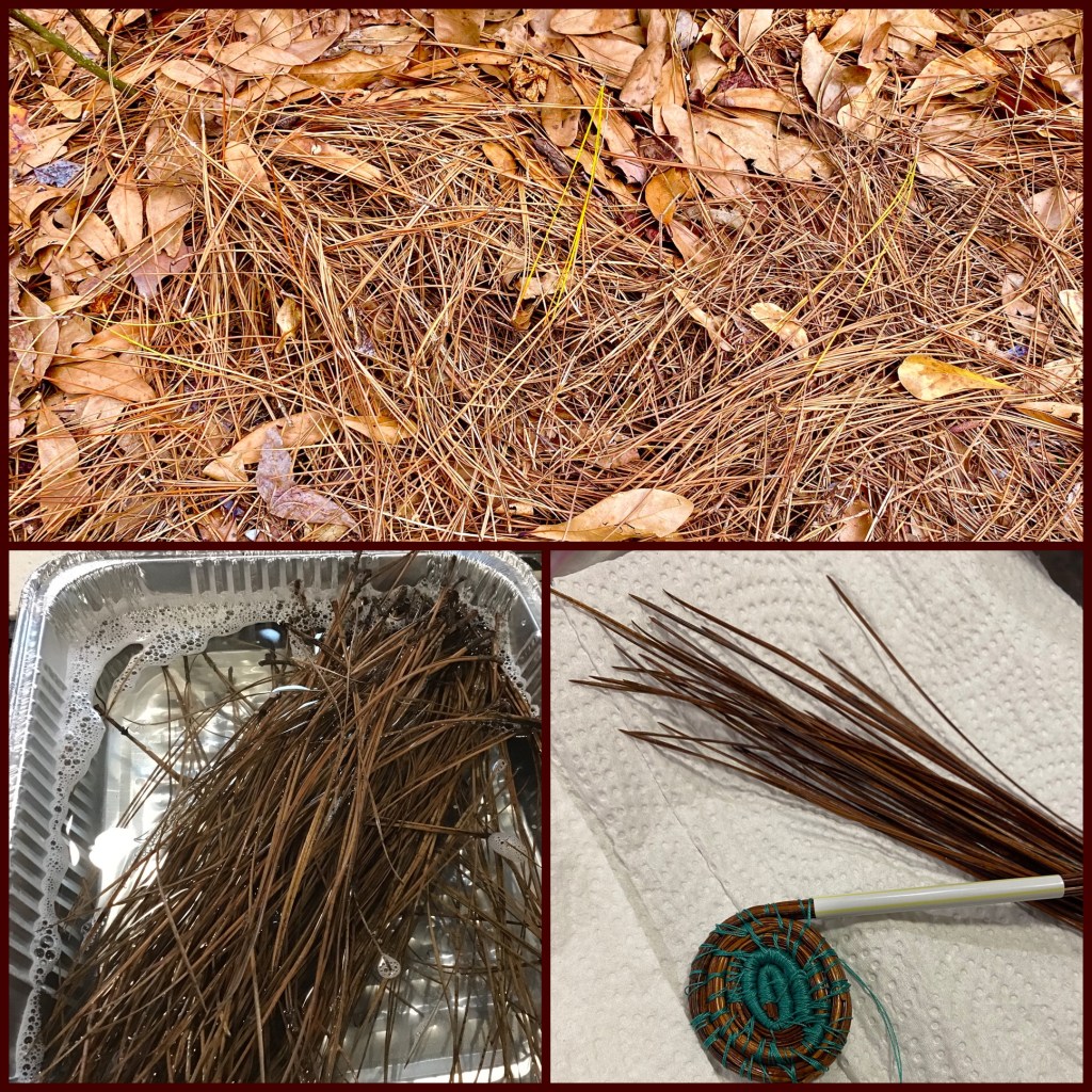 I collected, washed and steeped pine needles in boiling water. Watched a couple tutorials, however, I am missing the correct kind of thread. It should be wax coated polyester or linen. Of course I have several kinds at home but not here. This thread is a thick button thread but it is slippery. If it rains tomorrow…we may go in search of some! I do like the turquoise against the rust brown of the pine needles. Don’t you?