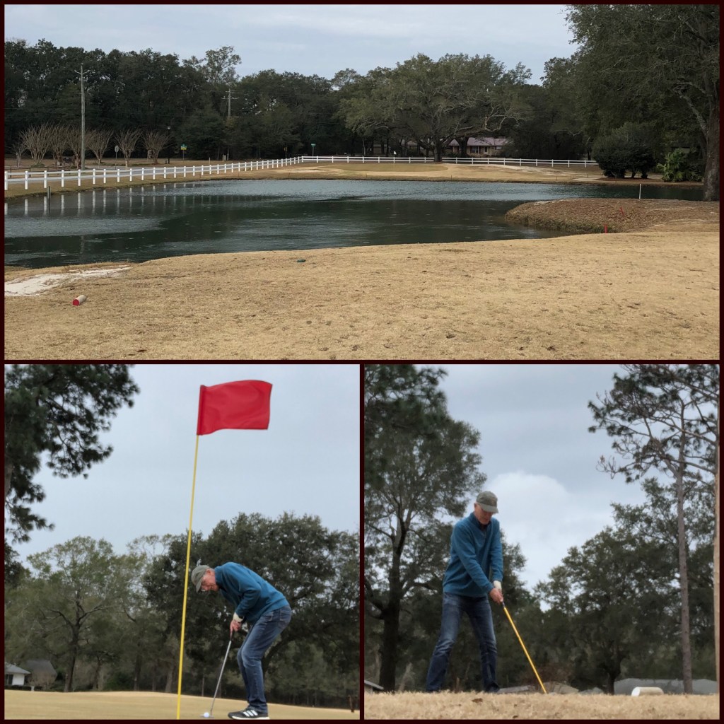 Back at Tanglewood, Harry took on the wind and didn’t do too badly! Look how straight out that flag is flying! The top picture is hole number eight.