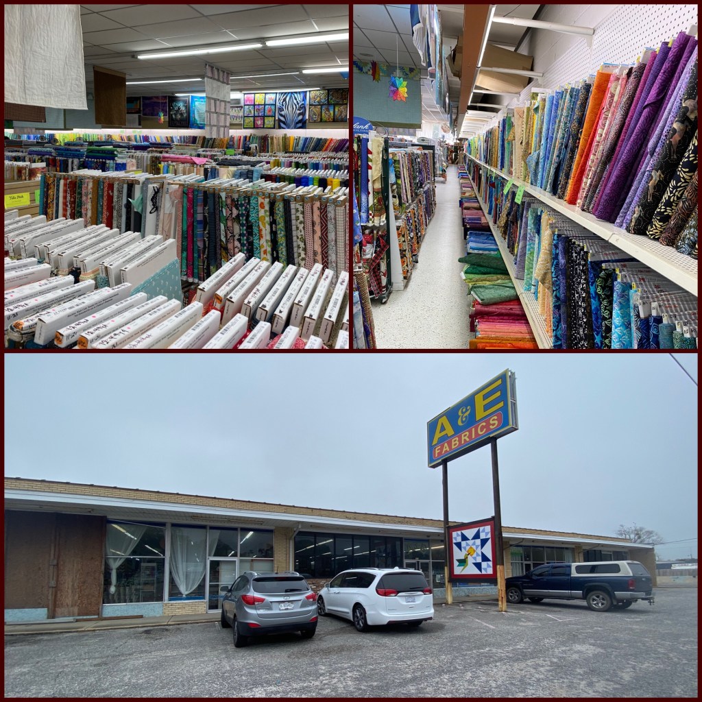 A fabric store is not Harry’s favorite shopping experience but because he loves me, he will go with me occasionally. The A & E Fabric store of Pensacola turned out to be a true surprise! Not quite as large as Mary Jo’s Cloth Store in Gastonia, NC, that I love, but it was quite large.