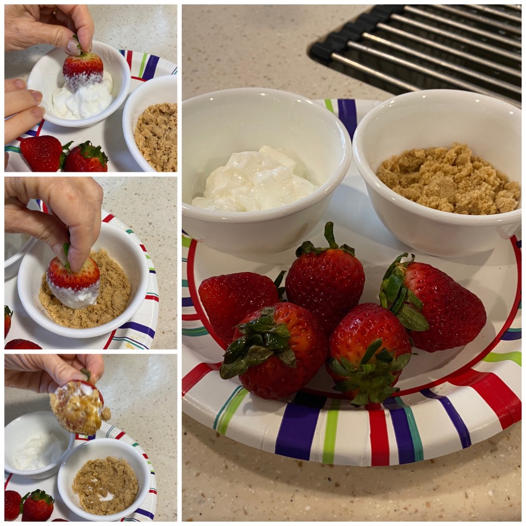I can’t remember if I have shared this with the blog or not. If so, forgive the duplication! It won’t be long before you, too can get fresh strawberries. We each had a plate like this for lunch today as our dessert. Too Good Yogurt in the top picture ( You could use sour cream)..a couple tablespoons in a bowl… 1-2 Tablespoons of brown sugar in the second bowl. Keep the caps on after you wash the berries, as they are useful to use as a handle. Dip first in the yogurt, then the brown sugar and pop in your mouth! You will be surprised how yummy it is.