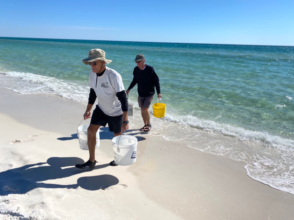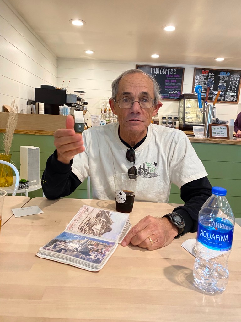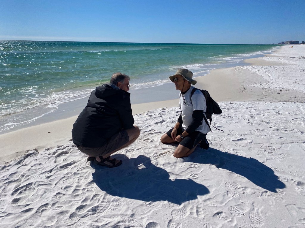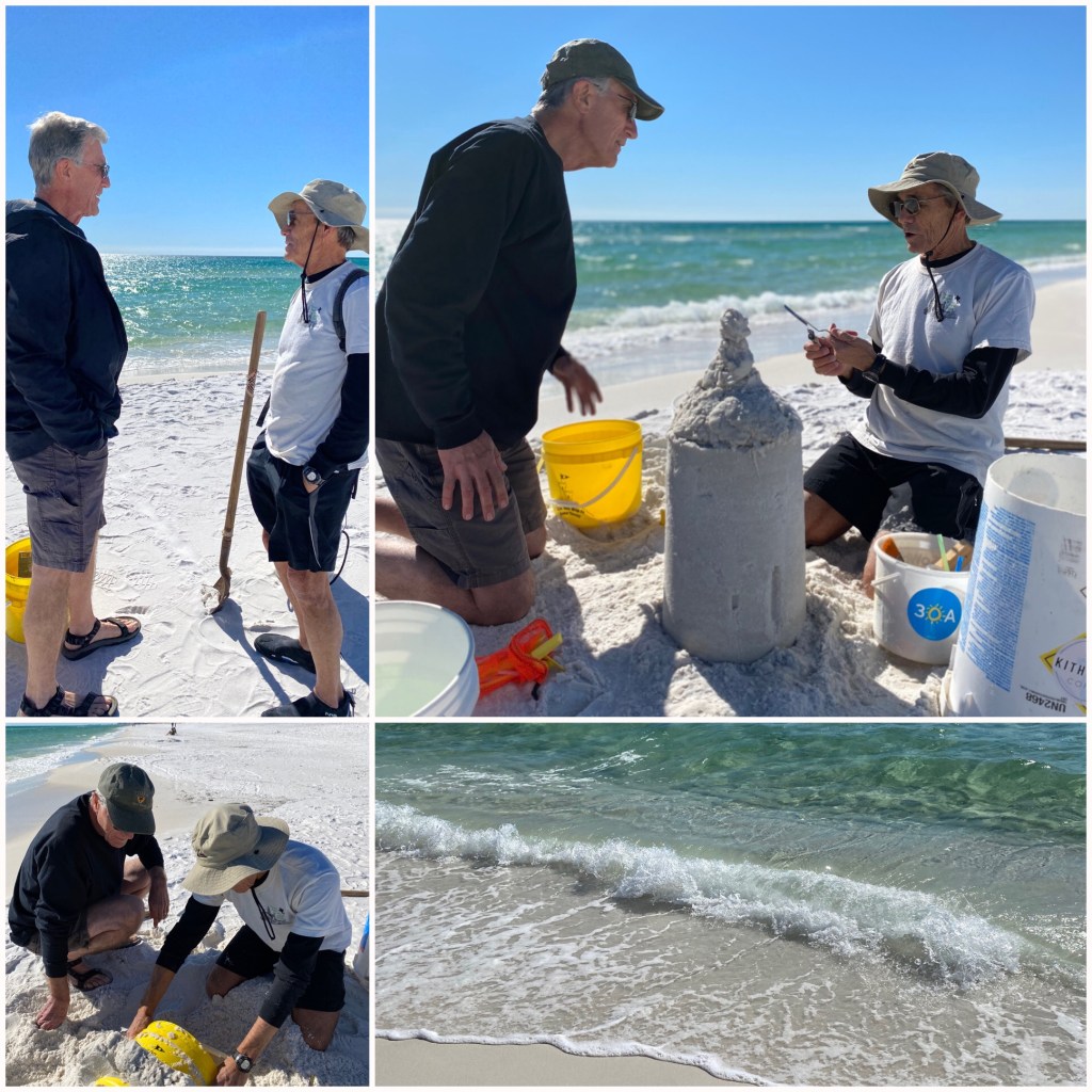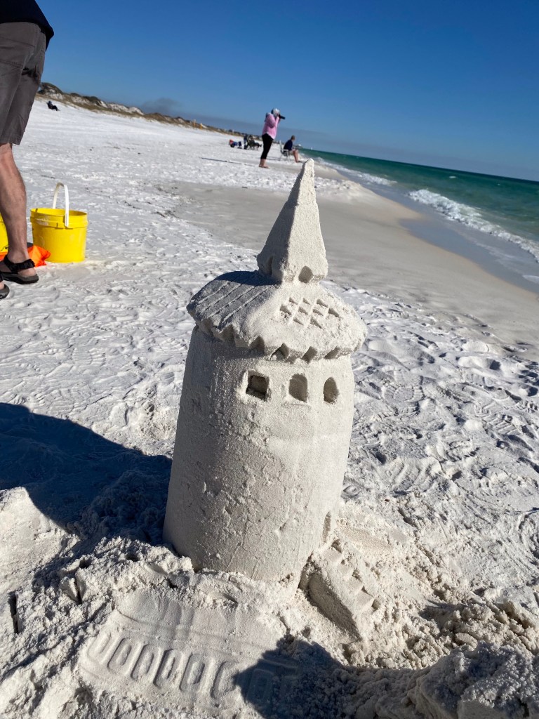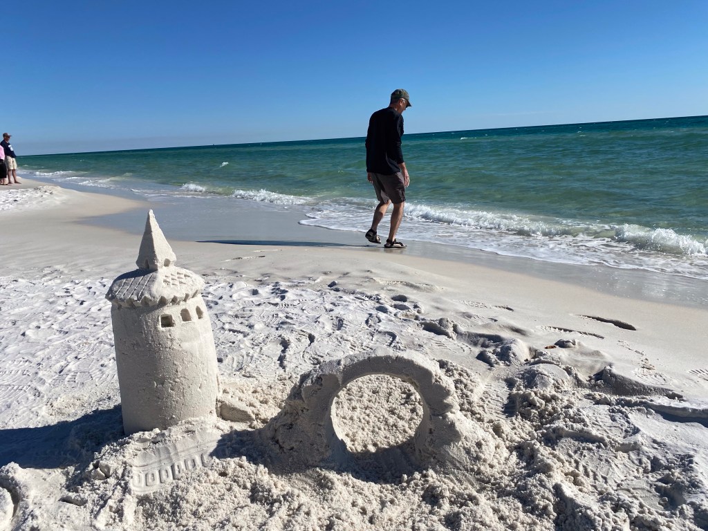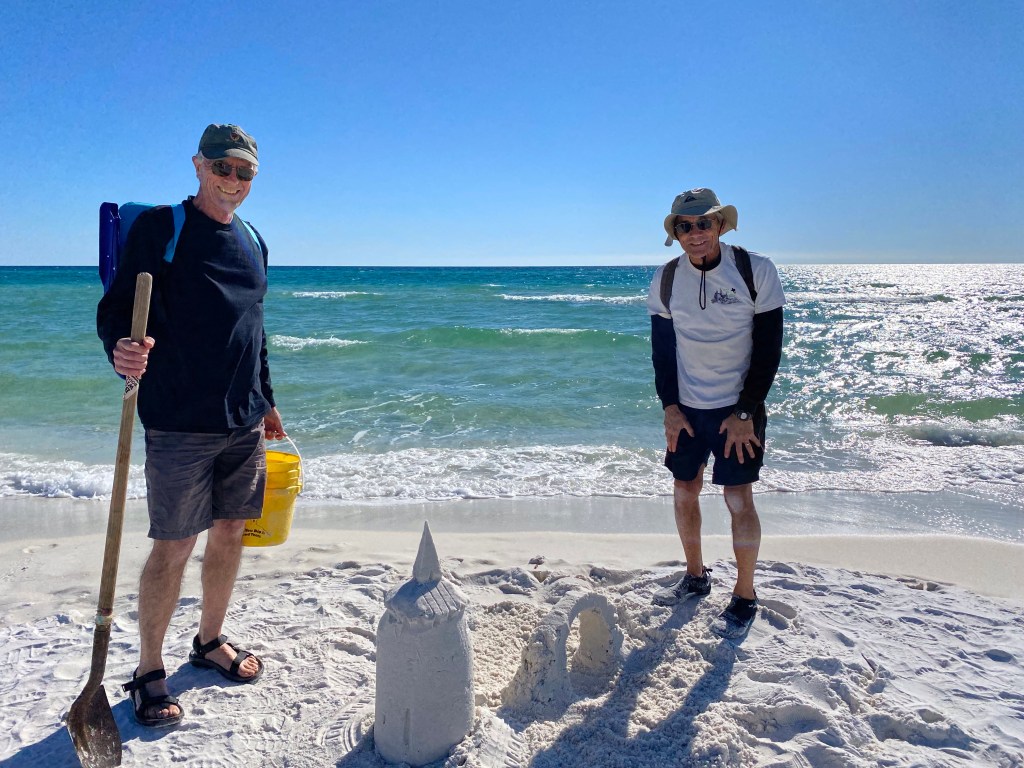 Mark Flynn of Santa Rosa Beach, Florida is a retired sand castle sculptor. Harry contacted him before we visited, explaining how he loved to play in the sand making sculptures. They went back and forth a few times and Mark invited Harry to contact him when he arrived and maybe they could get together to chat. They picked a date…today…Mark road a bike with a little cart behind him with his sandcastle tools in it and he met us at the Kith and Kin Coffee Shop. So, off the three of us went to see if Harry could learn any new tricks to add to his sand sculpting arsenal. Right off the bat Mark wasn’t sure of the wind. It was fairly brisk today. The temperature was 60° but I am sure with the wind chill if felt much colder to the guys dressed in shorts. But he was a good sport and the two of them sat in the sand and swapped stories and tips! Their ultimate end result was less than what either of them were capable of, but they stayed at it for a couple hours and when Mark could stand the cold no longer…we packed up and made our way back to the coffee house to warm up!