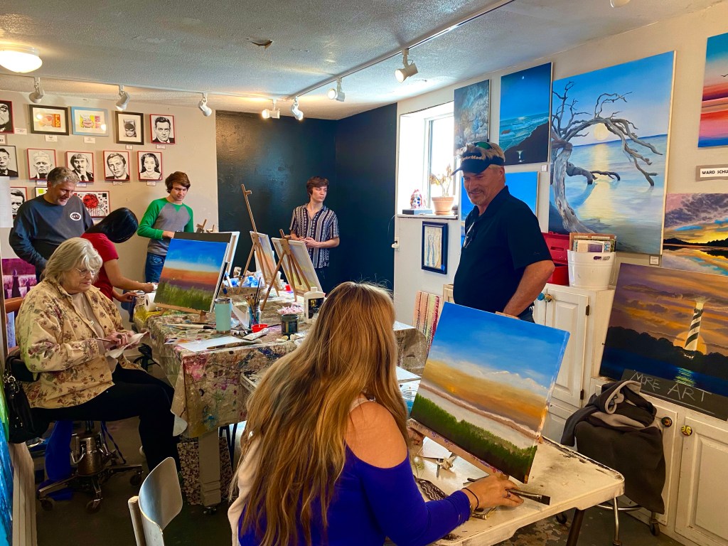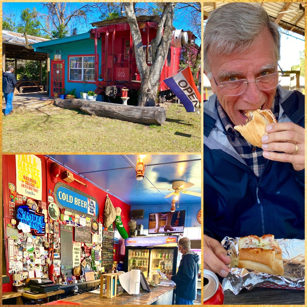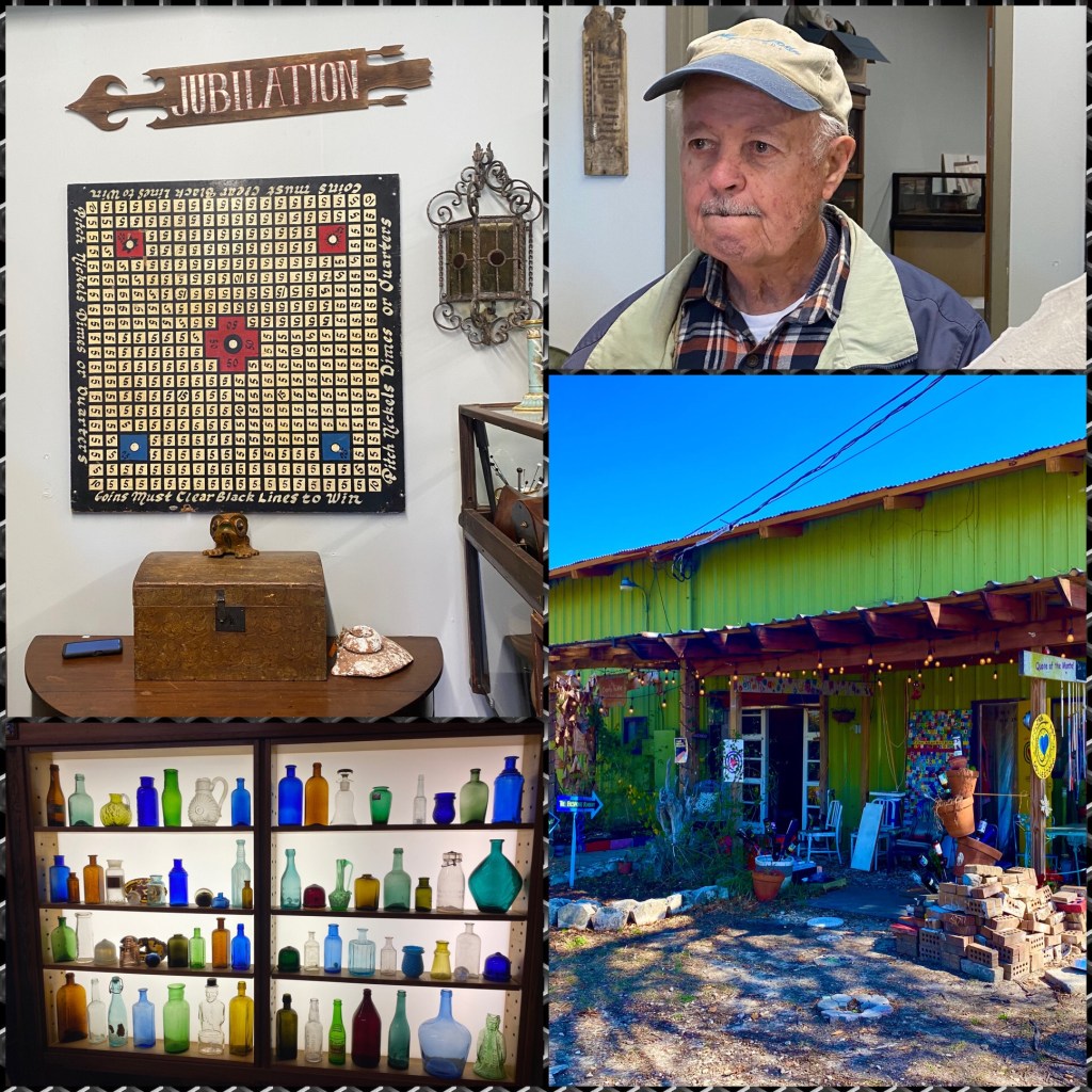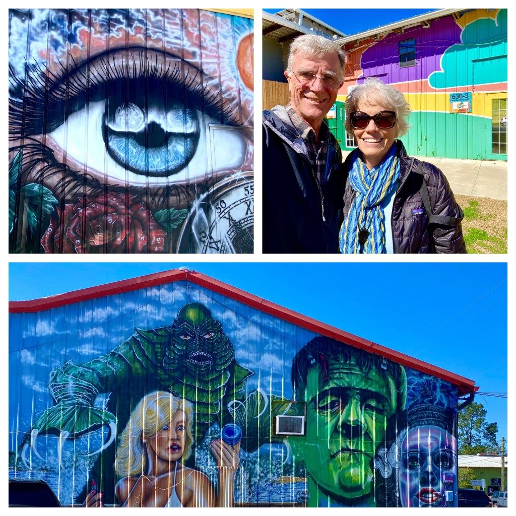 Do you see anyone you know in this picture?An astronaut mural photographed for my dear friend, Debbie! As a single mother, teacher, she always had the dream to work for NASA. With determination and hard work, she saw her dream come to fruition. She worked in Washington D.C. for the National Science Teacher’s Association with offices at NASA for a number of years. She was the Manager for the NASA Explorer School’s Program…Facilitating in the educating of classroom teachers through out the US in astronomy and space travel, she touched so many more students than she could have from her own classroom.Watching a mural in progress!We observed an oil painting class taking place. It was a small area for that many artists but it looked like fun! While traveling, I haven’t tried painting…the logistics of all the supplies and the drying issues have always stopped me.We purchased a little something from this man at an antique shop. At check-out Harry reminisced with him about fairs and that square board in the upper left. Having never seen one before, they shared with me that it was a type of betting game at fairs. You would throw your coin at the board that was laying on a table, and if it sat directly in the center they would get the equivalent money…if it touched the line at all…your coin belonged to the Carnival guy! Then he closed his eyes and shared how his mom would make his Birthday cake when he was a boy, burying 8 or 9 Liberty half dollars in the frosting. The kids were warned to be on the look out while they ate. What they found…they kept. Now that was a pretty random story, just out of the blue but I find, I too, have memories pop into my brain and it is always nice to have someone there to share the remembrance.On their door they had a sign that said… Community Theater for the Weird Community… That might include us…I am not sure if we would be prepared for it!We picked up lunch at the Crumb Box GastGarden. Harry had their famous meatball sandwich known far and wide as the most delicious meatball sandwich going! Harry said it was. The owner took our order, climbed up the caboose steps, cooked our meal and then ran it to us outside under the awning. He said it was just him, 90% of the time! Crazy! I asked him how many steps he walked in a day. Said he needed to buy a pedometer. My phone does it for me! Can you read Harry’s eyes? “You’re not taking a picture of me eating, are you? Oh, yes you are! “