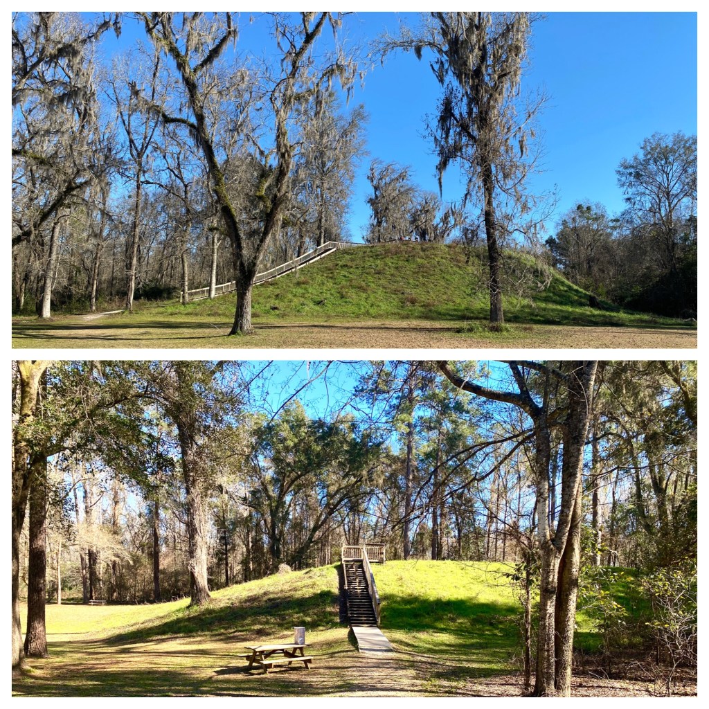 We spent the late afternoon crawling around these historical mounds. A trail to the old Butler Mill Ruins afforded us a brief but treacherous hike. Part of it was washed out and some sections of it had a very rooty surface, so much so, some of the roots had been painted yellow. Today the park site preserves the remains of six of the seven known earthen temple mounds in this area in Florida. We climbed two.