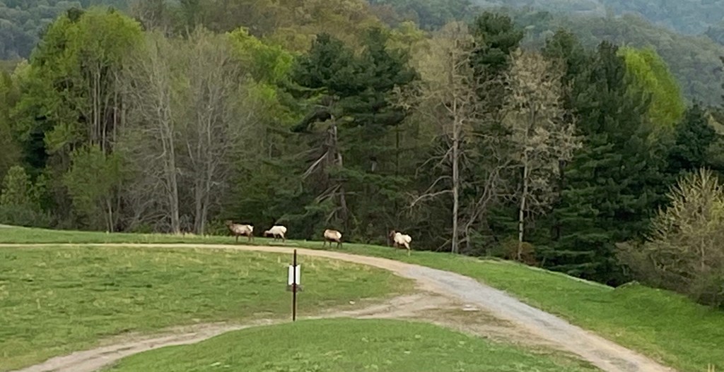 Somewhere between 2012 and 2014, 71 elk were relocated to Buchanan County from the Rocky Mountains. They have largely remained where they were released and have grown to a herd of almost 400. Interstate Breaks State Park takes visitors out every Saturday for a bag lunch dinner and to see if the majestic animals can be spotted. The elk management has been trying to eradicate the Autumn Olive invasive shrub that has taken over the hillsides! We saw a lot of earth moving equipment and huge hills that had been reseeded with wild grasses elk love to eat. This herd is not fed by the forestry service but must be able to sustain themselves on what the land can provide.
