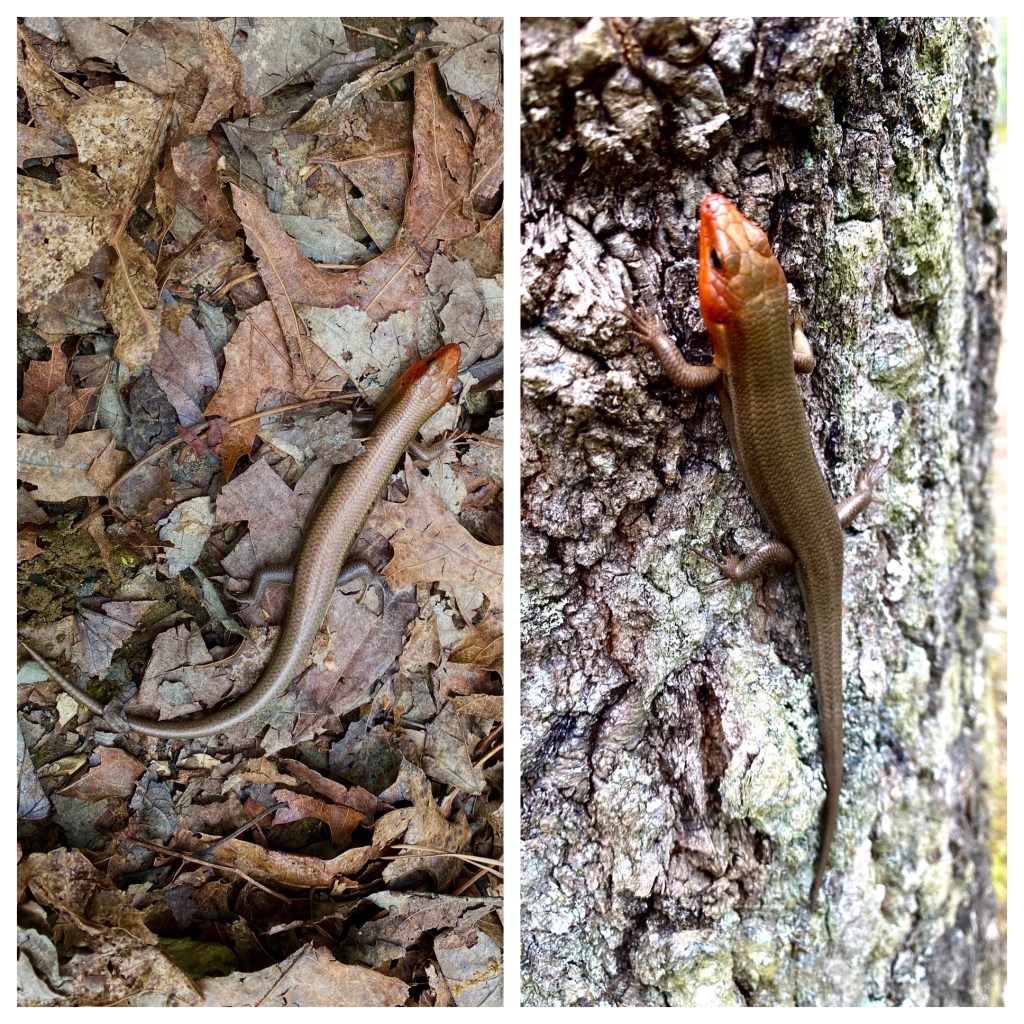 Broad-headed Skink. This is the same guy in the leaves where we spotted him and on the tree where Ruth Ann chased him when we were trying to get him to smile. The red head is more pronounced during breeding season.