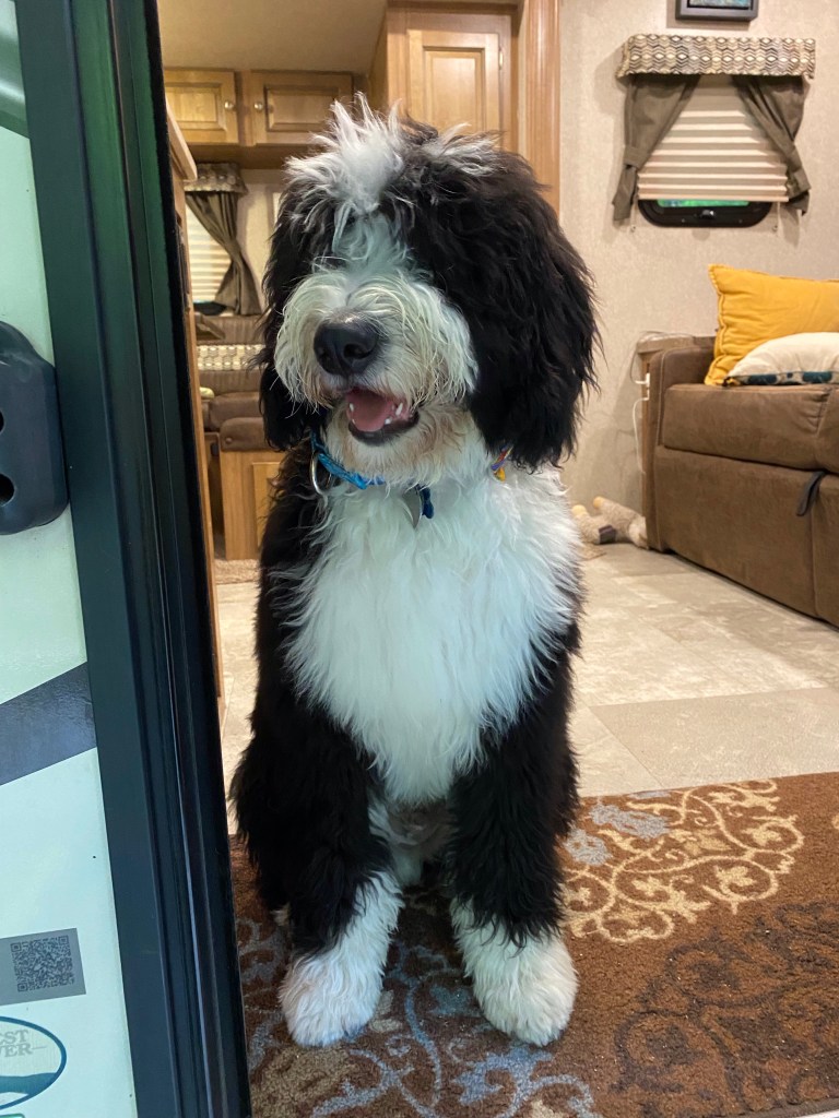 1. So far, he hasn’t acted too surprised at the tight quarters and long drives. We will see if he can stay tough! I will say he was a conversation piece at the campground.❤️