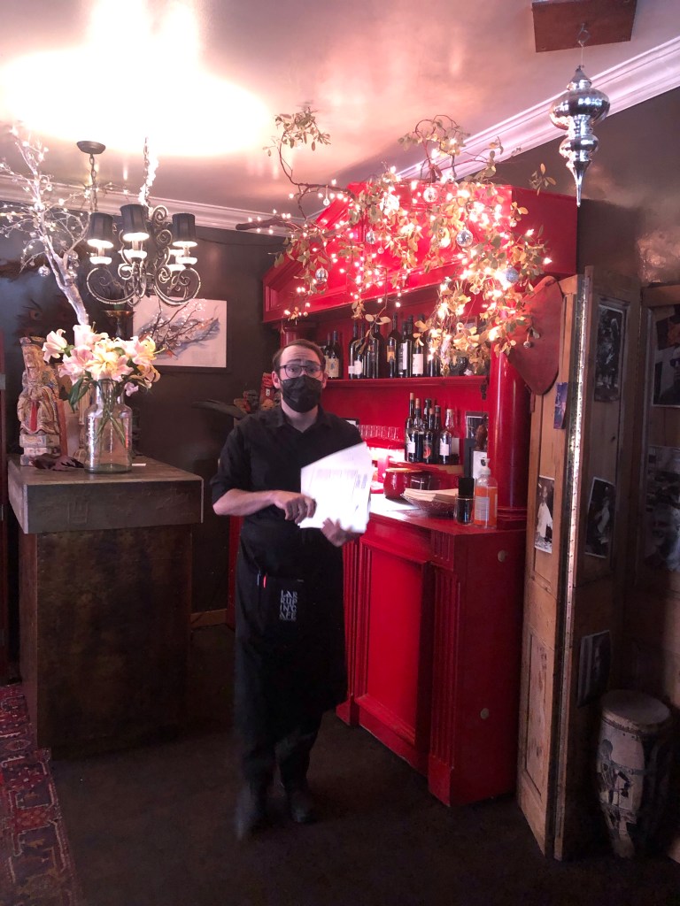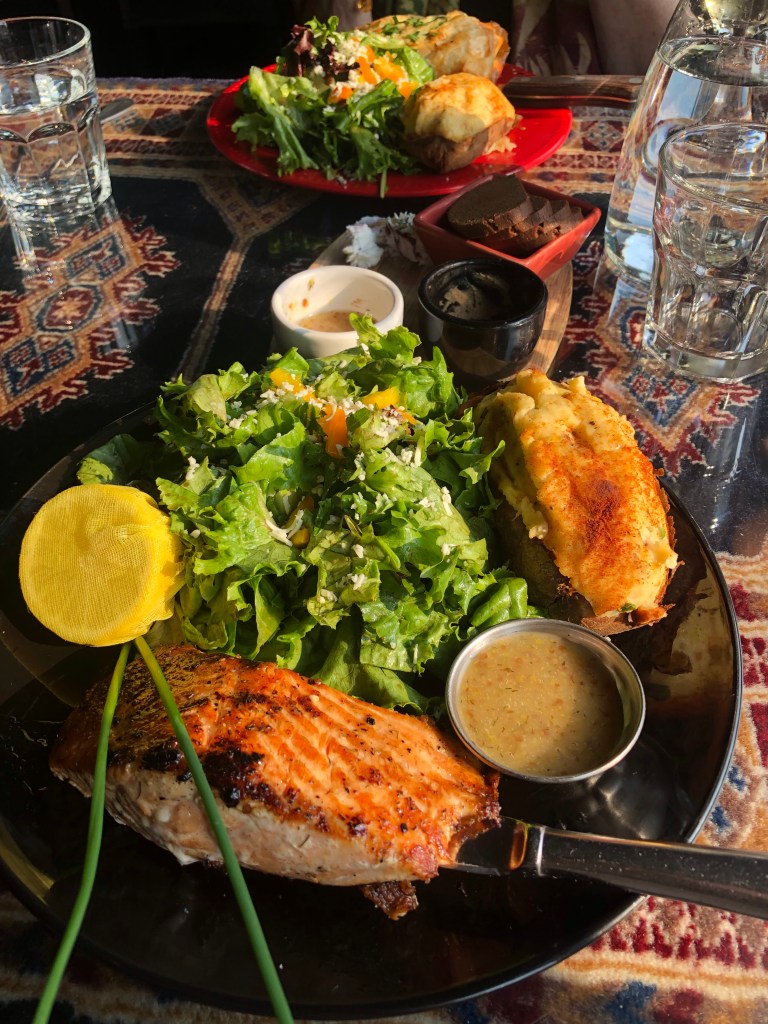 Fresh caught salmon for Harry and chicken in Phyllo pastry for me. I was originally going to order salmon, as well but our waitress, Lindsay, encouraged me to order the chicken dish. She shared that the recipe was 38 years old when Dixie, the owner opened the restaurant… It was one of the specialties and still is today! It was a good choice!