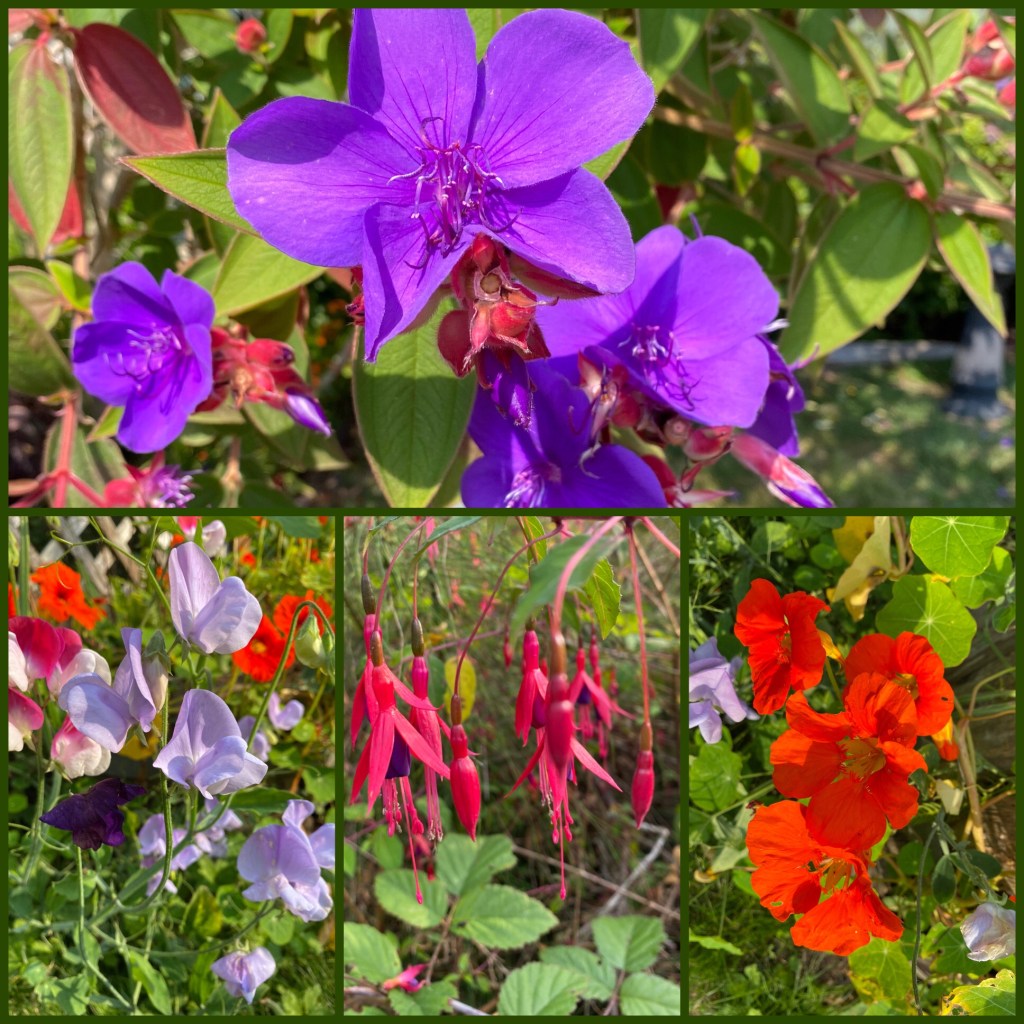The flowers in this area and specifically Azalea Glen are pretty. The purple is from a bush I had never seen before, on the bottom all three of these were growing like crazy at our site…sweet peas, fuchsia, and nasturtium.