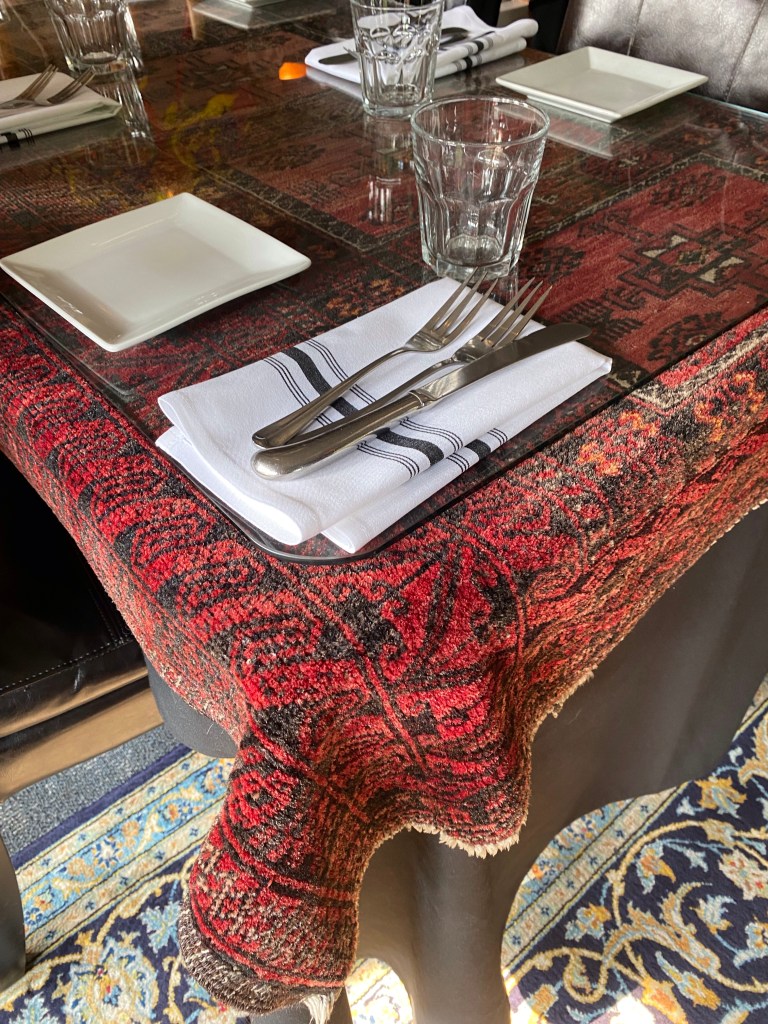 You may see this idea sometime at our home. Each table was draped in an oriental rig with glass placed over it! It made for a pretty table with the black tablecloths!