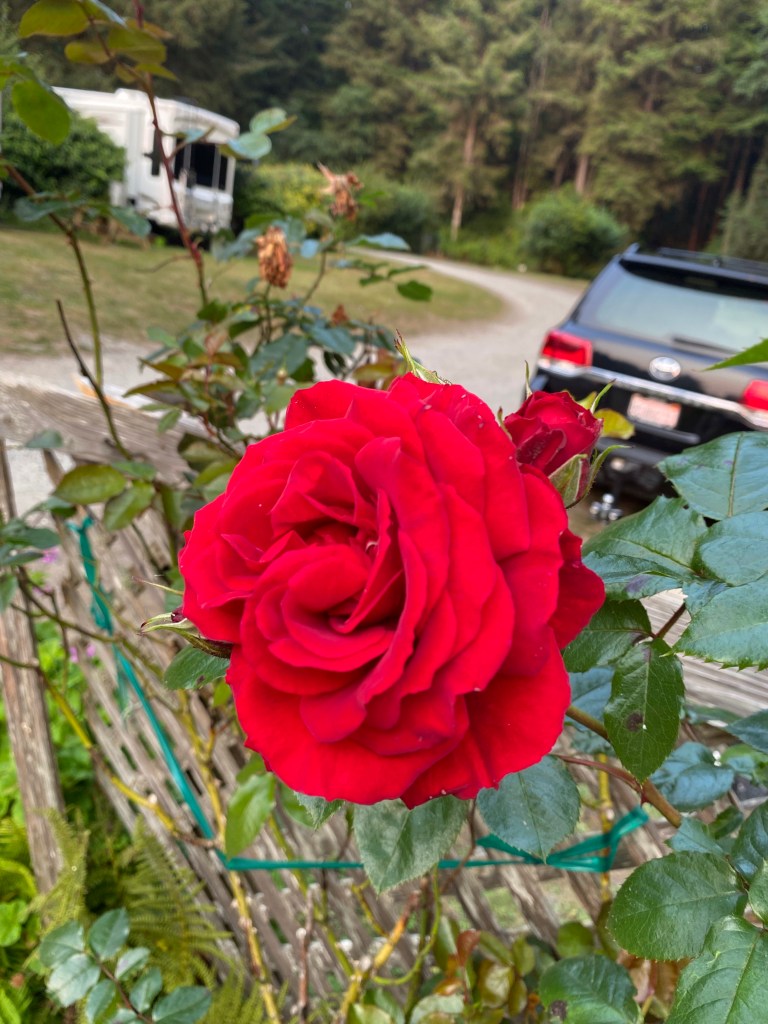 Our climbing rose and the car…very close next door. They are a young couple, whose breaks went out getting here. The wife said it was like riding a roller coaster! I bet! They had a roadside mechanic here most of the day. Before we leave tomorrow we will check in on them. We head out to Crater Lake tomorrow.