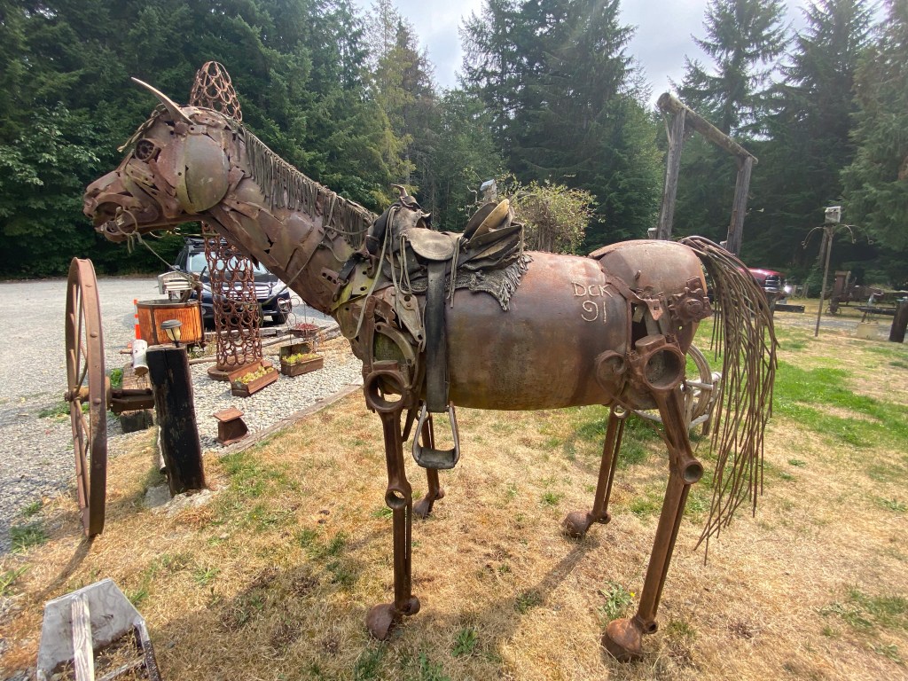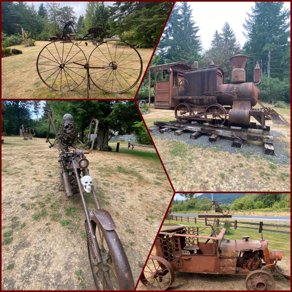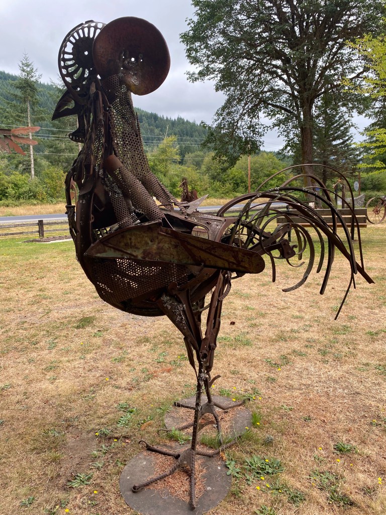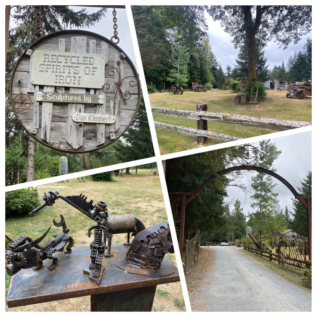 Today we woke to 53° and the weatherman said it wouldn’t get much higher than 68°. He hit it on the head! Wonderfully cool day but along with that came clouds and fog, covering Mt Rainier in the morning. I still was not 100% so Harry said we were not doing high altitudes today. We attended a fairly private-public showing of the life works of…master welder/ metal sculptor, Dan Klennert. It was nice because Finn got to attend, as well!