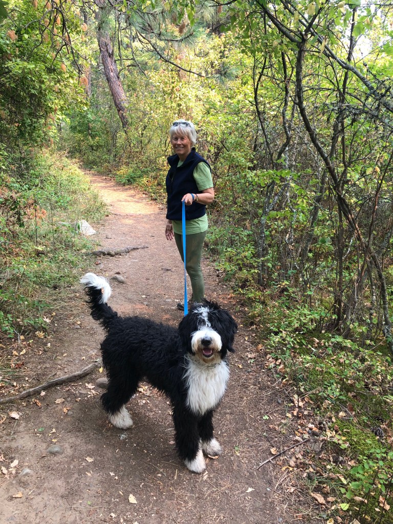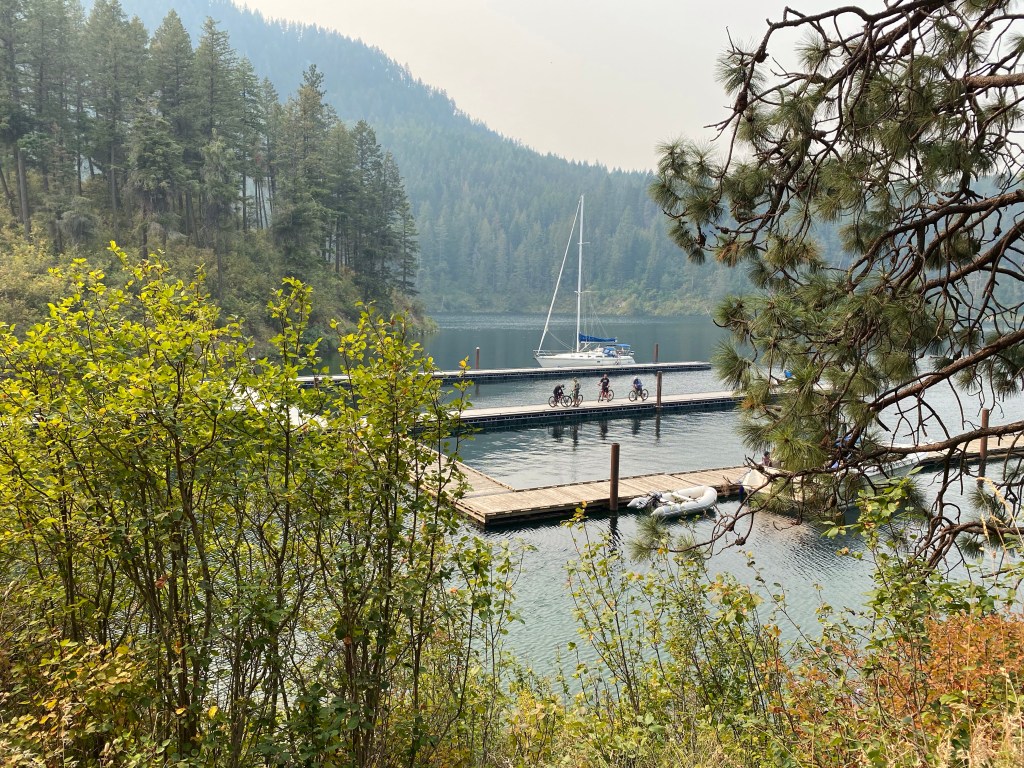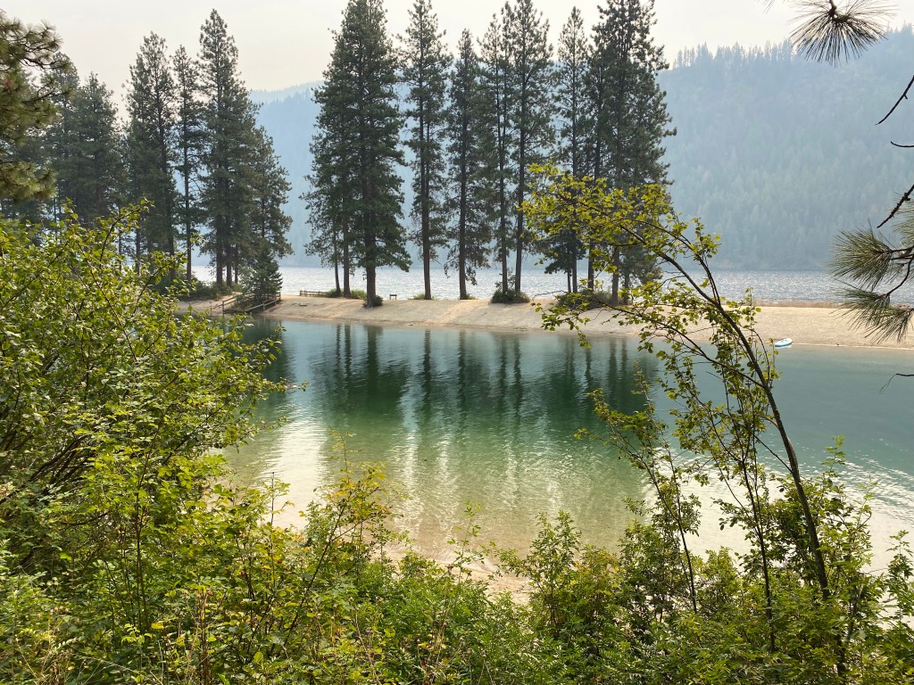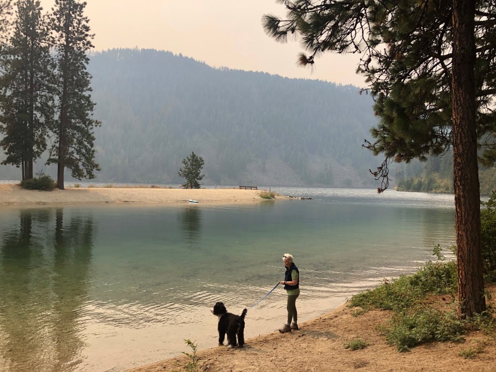The three of us hiked around Button Hook Bay. This pier system was pretty impressive. Located in Lake Pend Oreille. And still the smoke from the fires draws a haze over everything.Finn was not water shy. He walked right in. I think he would have gone in all the way with some encouragement, however, a wet dog in our small camper was not in the cards today.He loves to hike but this dog is a “swifter”. It takes me a good thirty to forty five minutes to brush the sticks, pine needles and leaf debris from his fur. And…those big feet of his collect pine sap and stickers which makes us stop to pull things out along the way. Being a fluffer as Kaitlyn, our granddaughter calls him, has it’s drawbacks!This little swimming area is called Beaver Bay Beach.