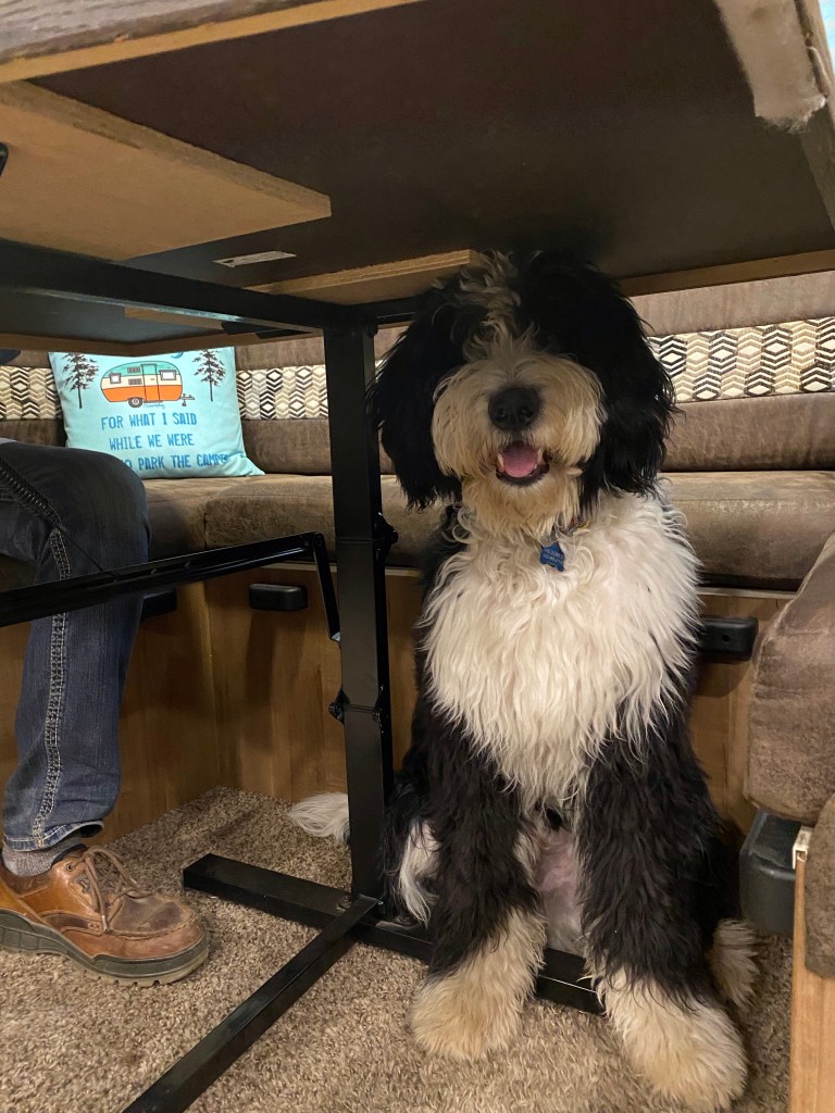 This morning we had a few housekeeping things to do. One of the things I had to do was clean Finn’s ears. I was also going to try to use scissors and trim some of the hair out of them. I brought the bottle out and you would think being a boy his size, it would be difficult to find a hiding place. The minute he saw the bottle…he was situated here and was not going to budge.