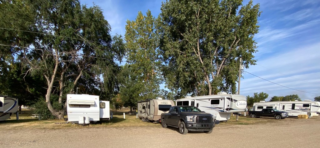 Our site this morning in the broad daylight. Rather crowded but not as crowded as it was last night. The park was hosting some sort of family activity night. This site was the only one that didn’t have cars parked in front of them. Had to forego hooking up to water as there were multiple connections off of our connector with hoses running everywhere. No problem, though…we had a great night’s sleep