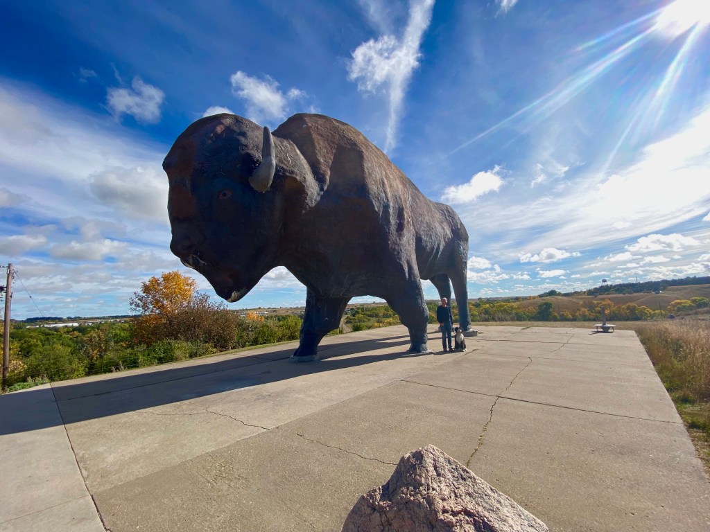 Harry and Finn in the bright sun! The sculpture was done by Elmer Peterson. Located in Jamestown North Dakota and erected in 1959.