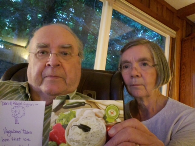 We decided to give the first two people responding to the broccoli bush a broccoli/ veggie dip kit . Travel Joan must be traveling as we haven’t heard back from her but we got a picture from Dan and Karol Lynn Johnson…they were the second to respond! They look very serious about their broccoli dip!