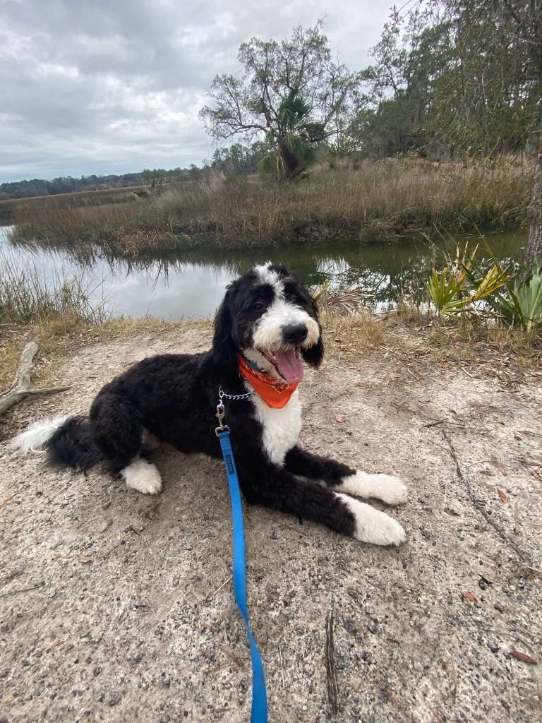 We are thankful Finn has not discovered the joy of playing in water yet! He sniffs around but has shown no interest in the swim!